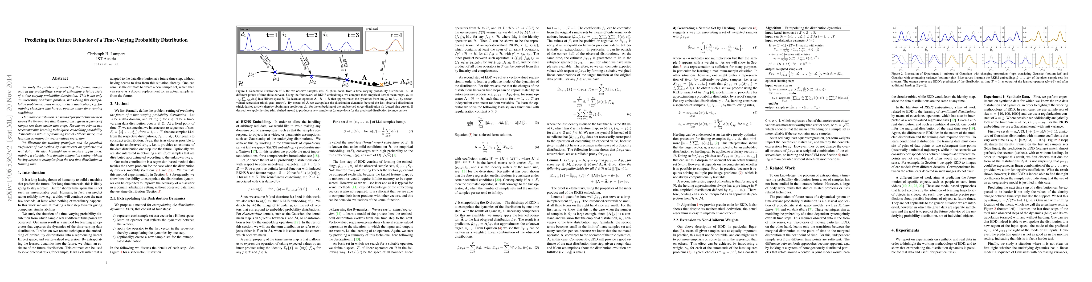 We study the problem of predicting the future, though only in the probabilistic sense of estimating a future state of a time-varying probability distribution. This is not only an interesting academic problem, but solving this extrapolation problem also has many practical application, e.g. for training classifiers that have to operate under time-varying conditions. Our main contribution is a method for predicting the next step of the time-varying distribution from a given sequence of sample sets from earlier time steps. For this we rely on two recent machine learning techniques: embedding probability distributions into a reproducing kernel Hilbert space, and learning operators by vector-valued regression. We illustrate the working principles and the practical usefulness of our method by experiments on synthetic and real data. We also highlight an exemplary application: training a classifier in a domain adaptation setting without having access to examples from the test time distribution at training time.