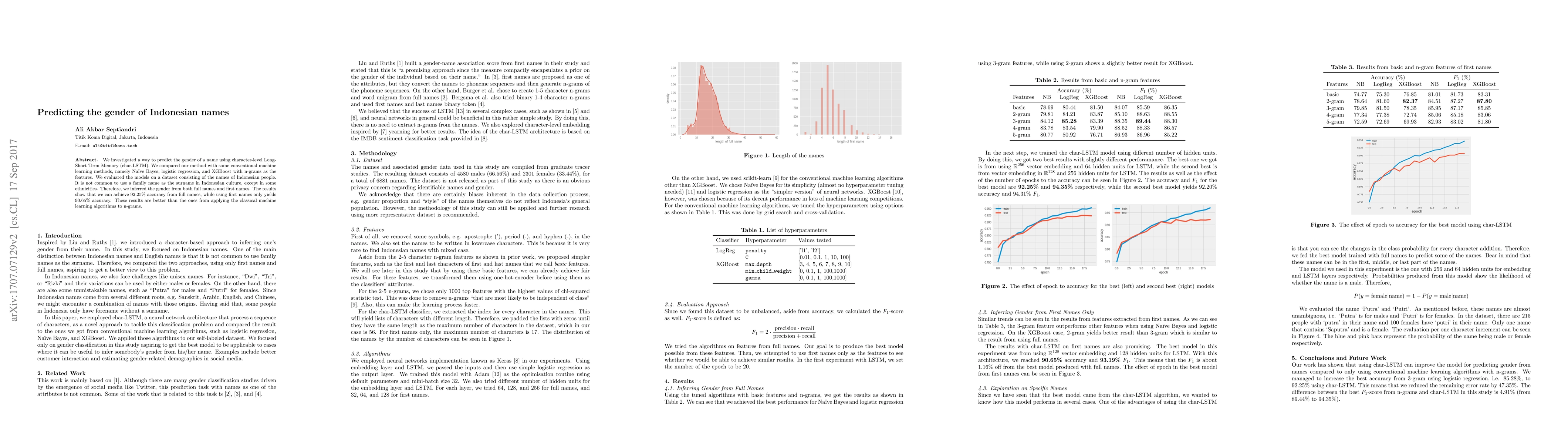 Researchers developed a char-LSTM model to predict Indonesian names' genders with 92.25% accuracy from full names, outperforming classical machine learning methods.