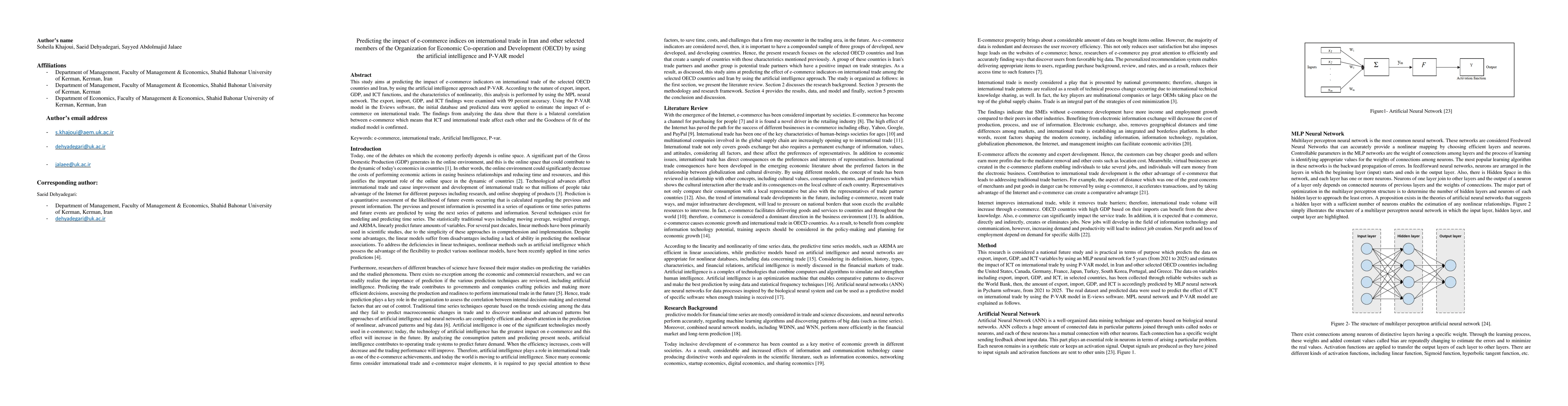 This study employs artificial intelligence and P-VAR models to predict e-commerce indicators' impact on international trade in Iran and selected OECD countries. Findings, analyzed using an MPL neural network, reveal a bilateral correlation between e-commerce and international trade, with a confirmed Goodness of fit.