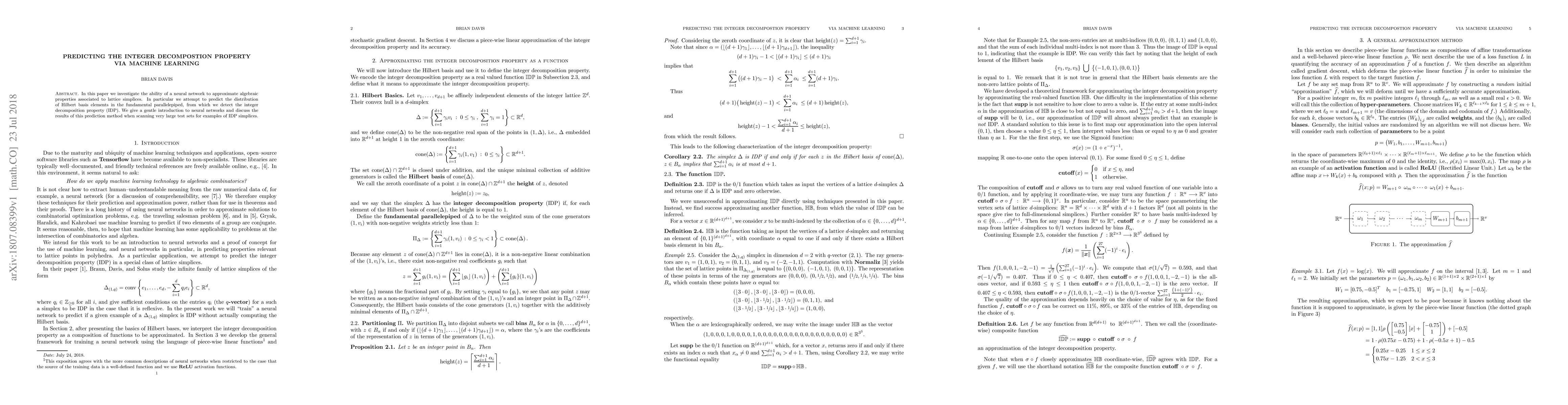 In this paper we investigate the ability of a neural network to approximate algebraic properties associated to lattice simplices. In particular we attempt to predict the distribution of Hilbert basis elements in the fundamental parallelepiped, from which we detect the integer decomposition property (IDP). We give a gentle introduction to neural networks and discuss the results of this prediction method when scanning very large test sets for examples of IDP simplices.