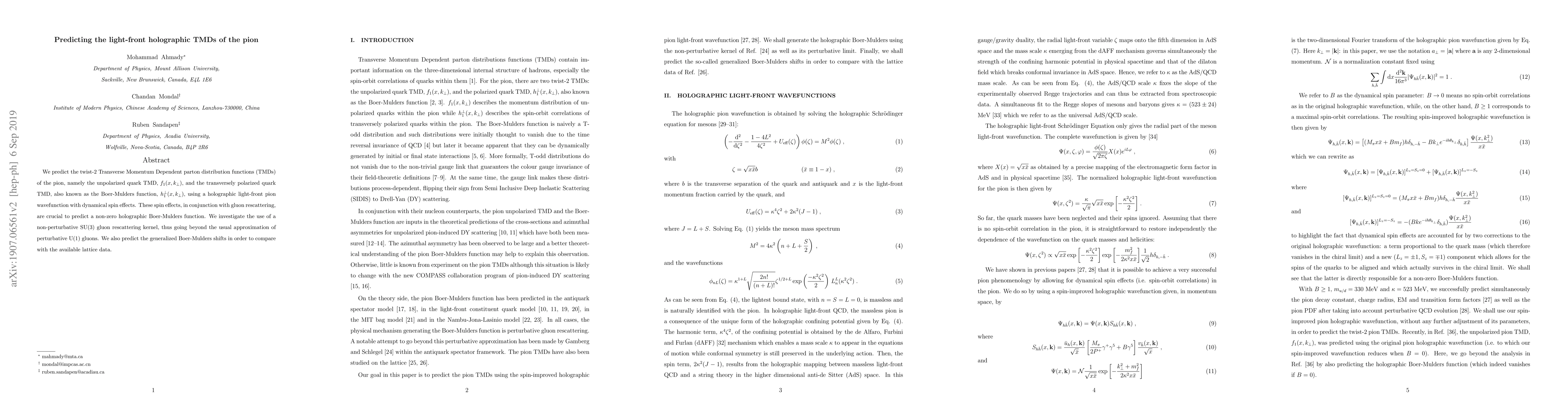 This paper predicts the twist-2 Transverse Momentum Dependent parton distribution functions of the pion using a holographic light-front wavefunction, focusing on the unpolarized quark TMD and the Boer-Mulders function. It employs non-perturbative SU(3) gluon rescattering to account for dynamical spin effects, offering a better fit to lattice data on Boer-Mulders shifts.