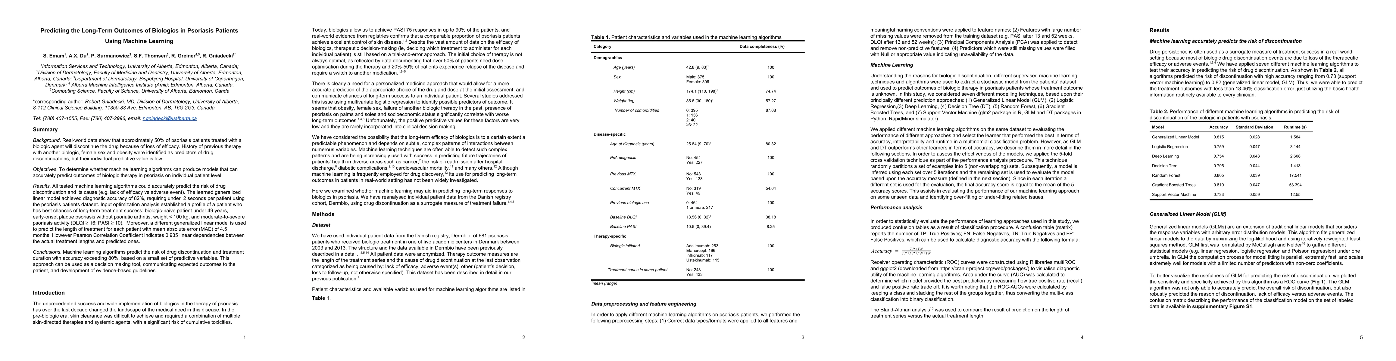 Background. Real-world data show that approximately 50% of psoriasis patients treated with a biologic agent will discontinue the drug because of loss of efficacy. History of previous therapy with another biologic, female sex and obesity were identified as predictors of drug discontinuations, but their individual predictive value is low. Objectives. To determine whether machine learning algorithms can produce models that can accurately predict outcomes of biologic therapy in psoriasis on individual patient level. Results. All tested machine learning algorithms could accurately predict the risk of drug discontinuation and its cause (e.g. lack of efficacy vs adverse event). The learned generalized linear model achieved diagnostic accuracy of 82%, requiring under 2 seconds per patient using the psoriasis patients dataset. Input optimization analysis established a profile of a patient who has best chances of long-term treatment success: biologic-naive patient under 49 years, early-onset plaque psoriasis without psoriatic arthritis, weight < 100 kg, and moderate-to-severe psoriasis activity (DLQI $\geq$ 16; PASI $\geq$ 10). Moreover, a different generalized linear model is used to predict the length of treatment for each patient with mean absolute error (MAE) of 4.5 months. However Pearson Correlation Coefficient indicates 0.935 linear dependencies between the actual treatment lengths and predicted ones. Conclusions. Machine learning algorithms predict the risk of drug discontinuation and treatment duration with accuracy exceeding 80%, based on a small set of predictive variables. This approach can be used as a decision-making tool, communicating expected outcomes to the patient, and development of evidence-based guidelines.