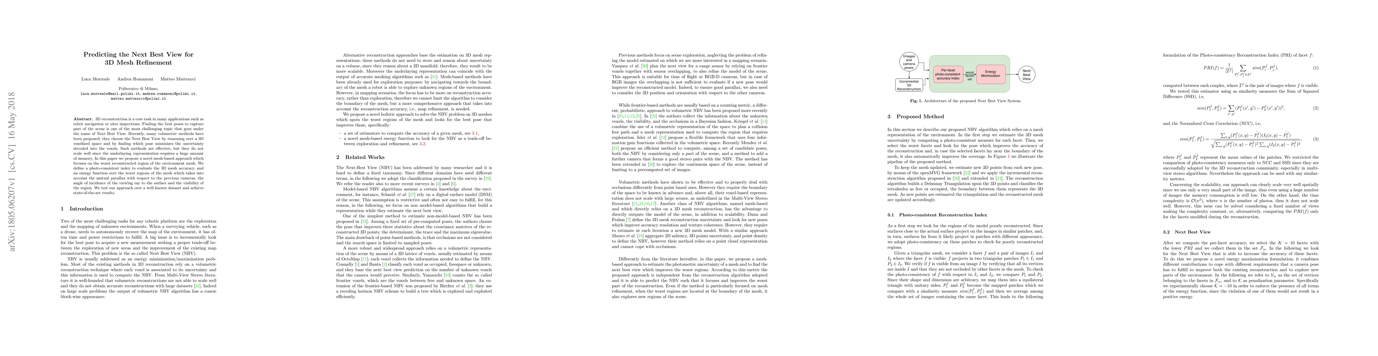 3D reconstruction is a core task in many applications such as robot navigation or sites inspections. Finding the best poses to capture part of the scene is one of the most challenging topic that goes under the name of Next Best View. Recently, many volumetric methods have been proposed; they choose the Next Best View by reasoning over a 3D voxelized space and by finding which pose minimizes the uncertainty decoded into the voxels. Such methods are effective, but they do not scale well since the underlaying representation requires a huge amount of memory. In this paper we propose a novel mesh-based approach which focuses on the worst reconstructed region of the environment mesh. We define a photo-consistent index to evaluate the 3D mesh accuracy, and an energy function over the worst regions of the mesh which takes into account the mutual parallax with respect to the previous cameras, the angle of incidence of the viewing ray to the surface and the visibility of the region. We test our approach over a well known dataset and achieve state-of-the-art results.