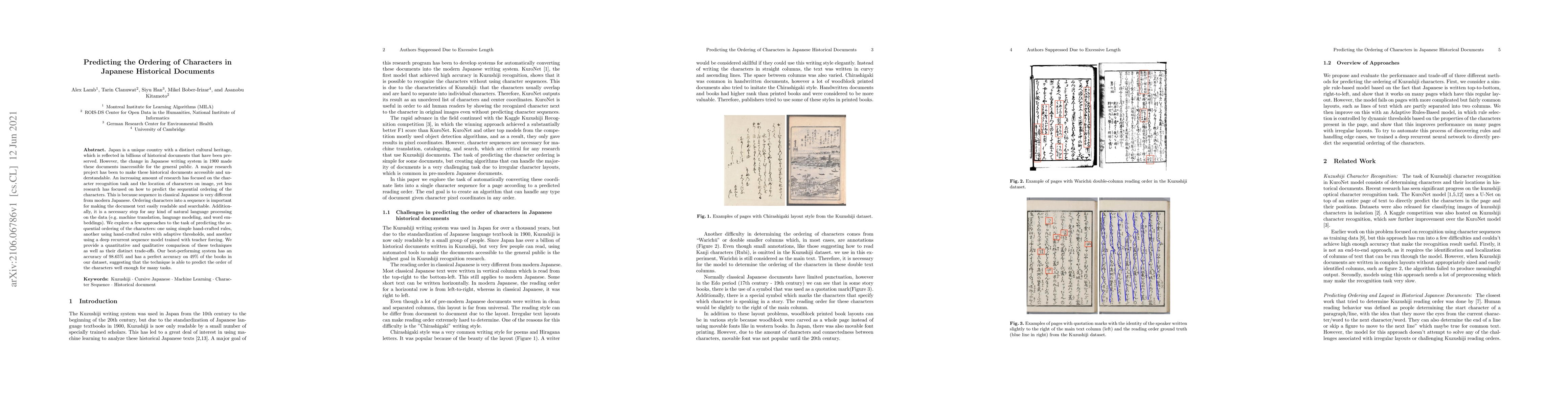 Japan is a unique country with a distinct cultural heritage, which is reflected in billions of historical documents that have been preserved. However, the change in Japanese writing system in 1900 made these documents inaccessible for the general public. A major research project has been to make these historical documents accessible and understandable. An increasing amount of research has focused on the character recognition task and the location of characters on image, yet less research has focused on how to predict the sequential ordering of the characters. This is because sequence in classical Japanese is very different from modern Japanese. Ordering characters into a sequence is important for making the document text easily readable and searchable. Additionally, it is a necessary step for any kind of natural language processing on the data (e.g. machine translation, language modeling, and word embeddings). We explore a few approaches to the task of predicting the sequential ordering of the characters: one using simple hand-crafted rules, another using hand-crafted rules with adaptive thresholds, and another using a deep recurrent sequence model trained with teacher forcing. We provide a quantitative and qualitative comparison of these techniques as well as their distinct trade-offs. Our best-performing system has an accuracy of 98.65\% and has a perfect accuracy on 49\% of the books in our dataset, suggesting that the technique is able to predict the order of the characters well enough for many tasks.