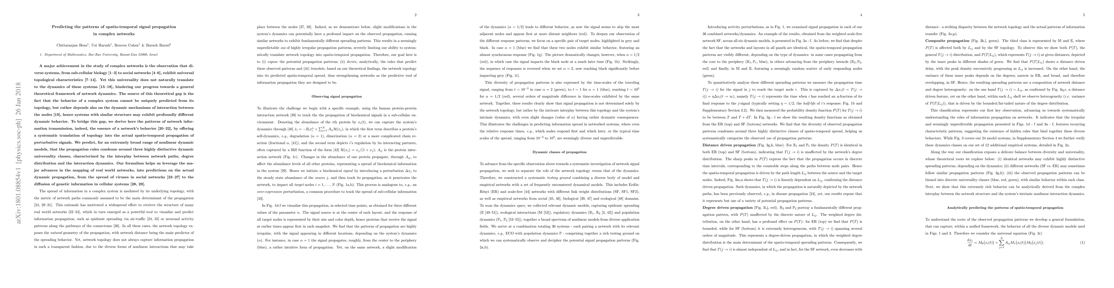 This paper develops a theoretical framework to predict the dynamic behavior of complex networks by translating their topological characteristics into spatio-temporal signal propagation patterns. It identifies three universal dynamic universality classes based on network path, degree distribution, and interaction dynamics, aiding in predicting real-world phenomena like virus spread in social networks.