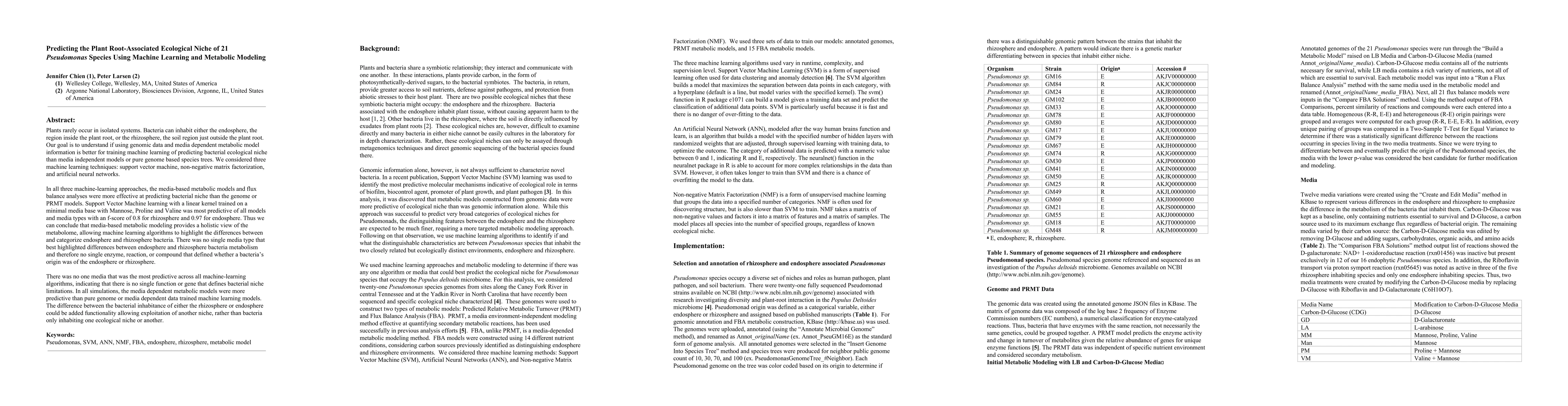 This study uses machine learning and metabolic modeling to predict the ecological niche of 21 Pseudomonas species associated with plant roots. Media-based metabolic models proved superior to genome-based models for predicting whether bacteria reside in the endosphere or rhizosphere, with Support Vector Machine trained on minimal media being the most effective.