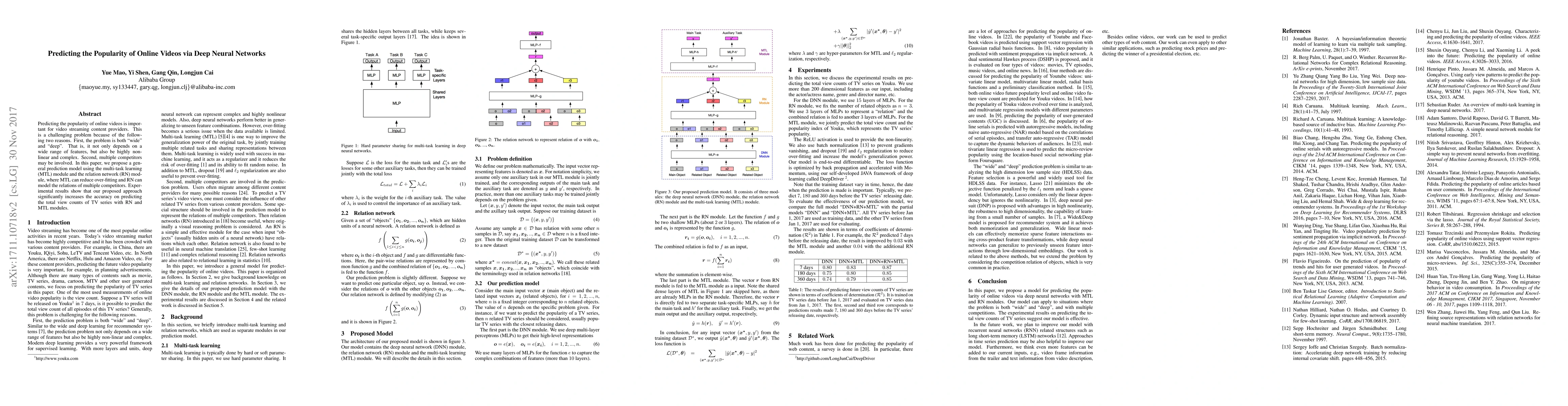 This paper proposes a deep neural network model using multi-task learning and relation networks to predict online video popularity, addressing both the complexity and competitive dynamics of the problem. Experimental results demonstrate improved accuracy in predicting total view counts for TV series.