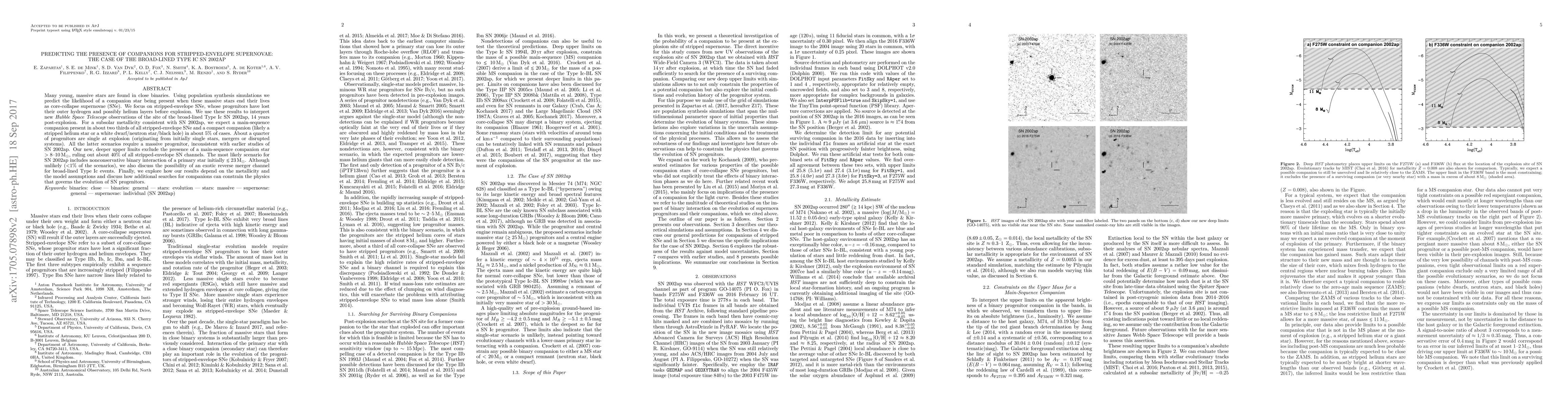 Many young, massive stars are found in close binaries. Using population synthesis simulations we predict the likelihood of a companion star being present when these massive stars end their lives as core-collapse supernovae (SNe). We focus on stripped-envelope SNe, whose progenitors have lost their outer hydrogen and possibly helium layers before explosion. We use these results to interpret new Hubble Space Telescope observations of the site of the broad-lined Type Ic SN 2002ap, 14 years post-explosion. For a subsolar metallicity consistent with SN 2002ap, we expect a main-sequence companion present in about two thirds of all stripped-envelope SNe and a compact companion (likely a stripped helium star or a white dwarf/neutron star/black hole) in about 5% of cases. About a quarter of progenitors are single at explosion (originating from initially single stars, mergers or disrupted systems). All the latter scenarios require a massive progenitor, inconsistent with earlier studies of SN 2002ap. Our new, deeper upper limits exclude the presence of a main-sequence companion star $>8$-$10$ Msun, ruling out about 40% of all stripped-envelope SN channels. The most likely scenario for SN 2002ap includes nonconservative binary interaction of a primary star initially $\lesssim 23$ Msun. Although unlikely ($<$1% of the scenarios), we also discuss the possibility of an exotic reverse merger channel for broad-lined Type Ic events. Finally, we explore how our results depend on the metallicity and the model assumptions and discuss how additional searches for companions can constrain the physics that governs the evolution of SN progenitors.