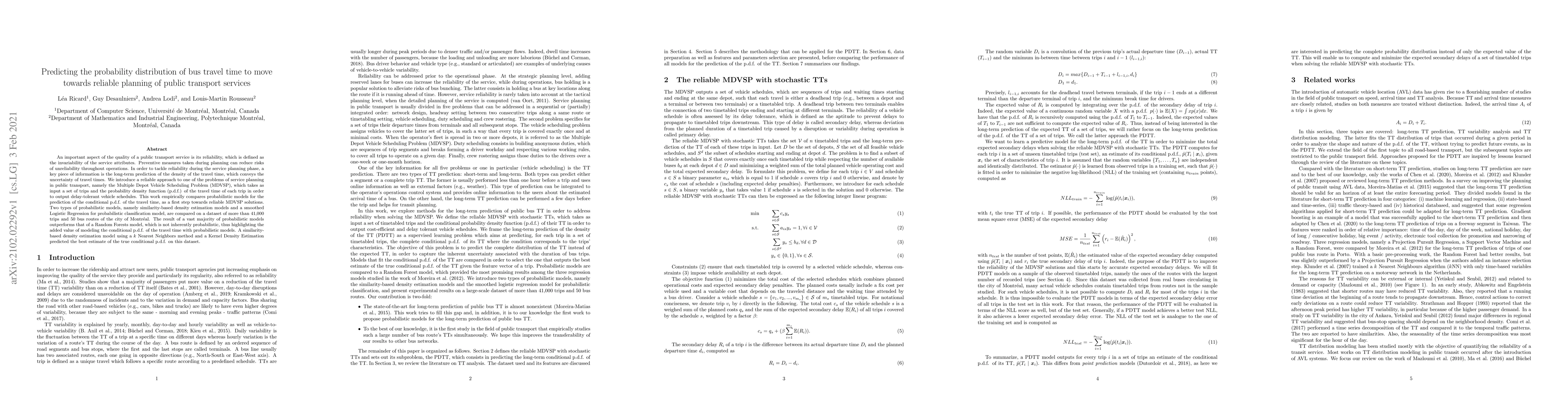 An important aspect of the quality of a public transport service is its reliability, which is defined as the invariability of the service attributes. Preventive measures taken during planning can reduce risks of unreliability throughout operations. In order to tackle reliability during the service planning phase, a key piece of information is the long-term prediction of the density of the travel time, which conveys the uncertainty of travel times. We introduce a reliable approach to one of the problems of service planning in public transport, namely the Multiple Depot Vehicle Scheduling Problem (MDVSP), which takes as input a set of trips and the probability density function (p.d.f.) of the travel time of each trip in order to output delay-tolerant vehicle schedules. This work empirically compares probabilistic models for the prediction of the conditional p.d.f. of the travel time, as a first step towards reliable MDVSP solutions. Two types of probabilistic models, namely similarity-based density estimation models and a smoothed Logistic Regression for probabilistic classification model, are compared on a dataset of more than 41,000 trips and 50 bus routes of the city of Montr\'eal. The result of a vast majority of probabilistic models outperforms that of a Random Forests model, which is not inherently probabilistic, thus highlighting the added value of modeling the conditional p.d.f. of the travel time with probabilistic models. A similarity-based density estimation model using a $k$ Nearest Neighbors method and a Kernel Density Estimation predicted the best estimate of the true conditional p.d.f. on this dataset.