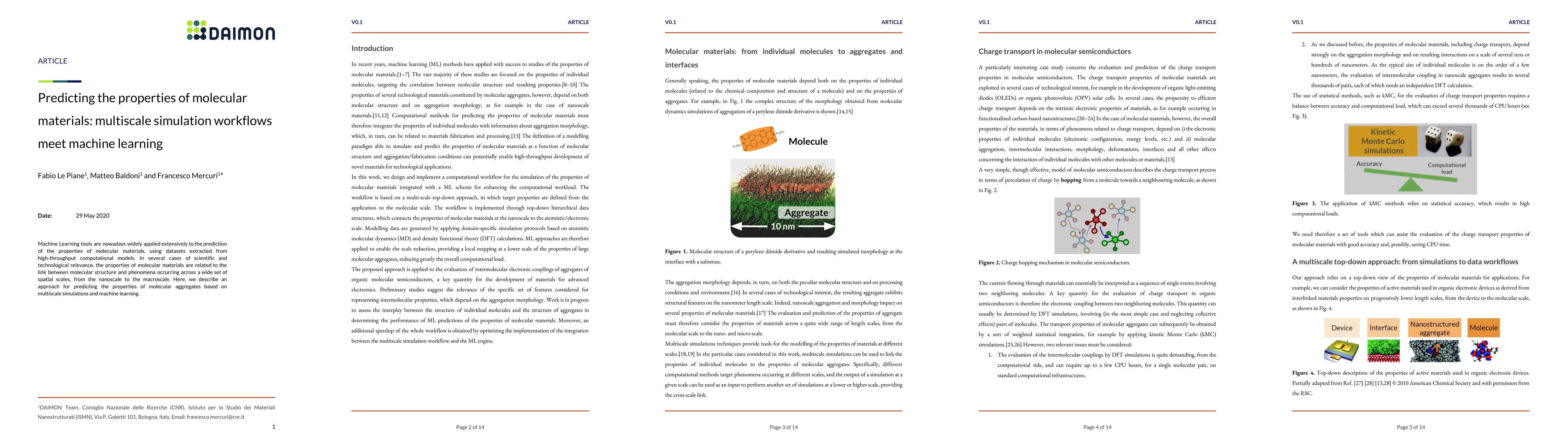 Machine Learning tools are nowadays widely applied extensively to the prediction of the properties of molecular materials, using datasets extracted from high-throughput computational models. In several cases of scientific and technological relevance, the properties of molecular materials are related to the link between molecular structure and phenomena occurring across a wide set of spatial scales, from the nanoscale to the macroscale. Here, we describe an approach for predicting the properties of molecular aggregates based on multiscale simulations and machine learning.