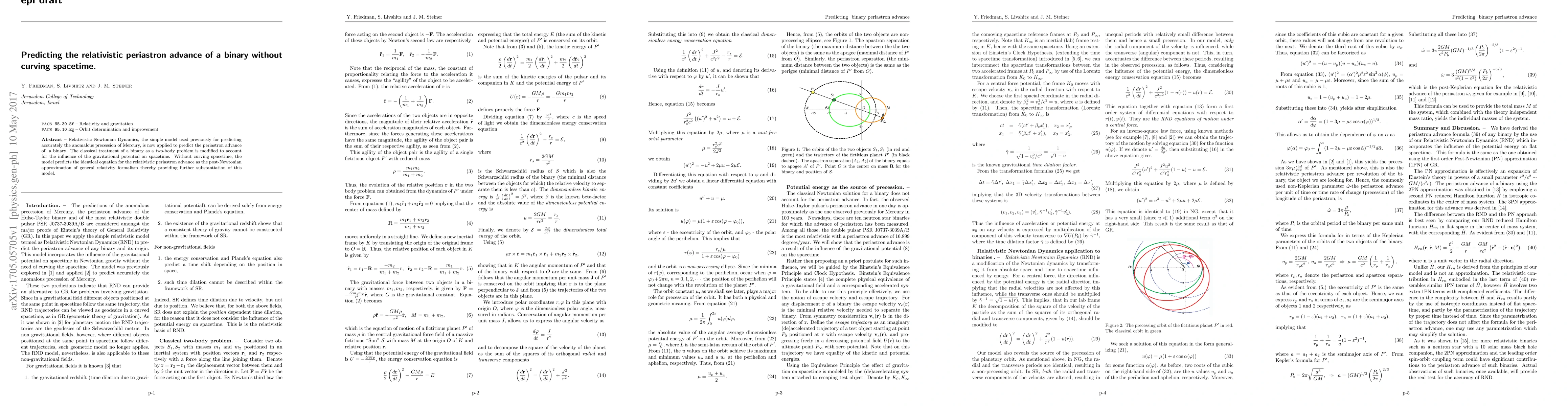 Relativistic Newtonian Dynamics, the simple model used previously for predicting accurately the anomalous precession of Mercury, is now applied to predict the periastron advance of a binary. The classical treatment of a binary as a two-body problem is modified to account for the influence of the gravitational potential on spacetime. Without curving spacetime, the model predicts the identical equation for the relativistic periastron advance as the post-Newtonian approximation of general relativity formalism thereby providing further substantiation of this model.