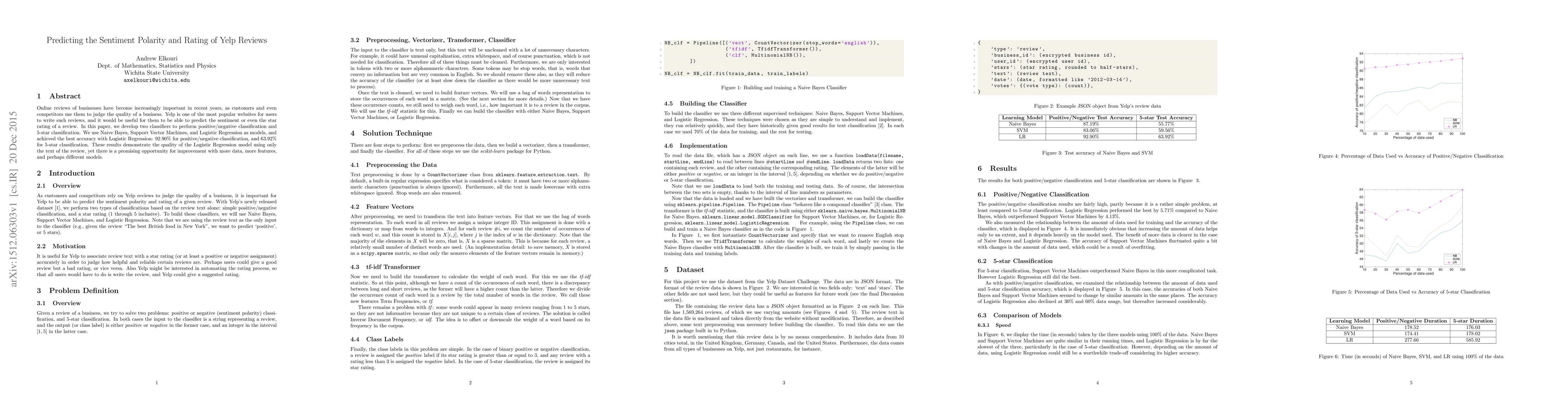 This paper develops two classifiers to predict the sentiment polarity and star rating of Yelp reviews, using Naive Bayes, Support Vector Machines, and Logistic Regression. Logistic Regression achieved the highest accuracy, 92.90% for sentiment classification and 63.92% for 5-star rating, indicating potential for further improvement with additional data and features.