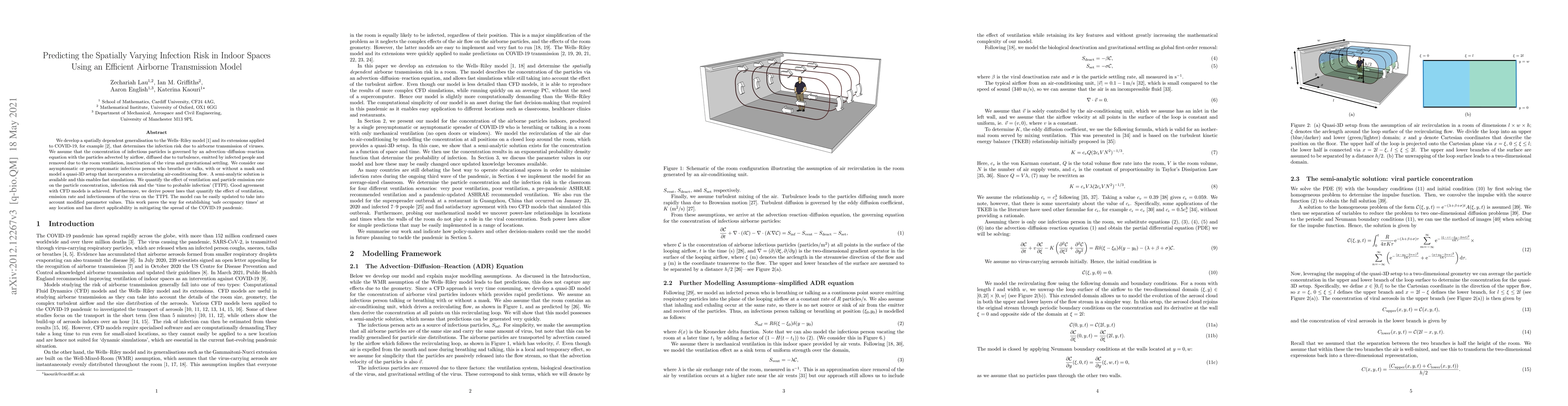 We develop a spatially dependent generalisation to the Wells-Riley model and its extensions applied to COVID-19, that determines the infection risk due to airborne transmission of viruses. We assume that the concentration of infectious particles is governed by an advection-diffusion-reaction equation with the particles advected by airflow, diffused due to turbulence, emitted by infected people and removed due to the room ventilation, inactivation of the virus and gravitational settling. We consider one asymptomatic or presymptomatic infectious person who breathes or talks, with or without a mask and model a quasi-3D setup that incorporates a recirculating air-conditioning flow. A semi-analytic solution is available and this enables fast simulations. We quantify the effect of ventilation and particle emission rate on the particle concentration, infection risk and the `time to probable infection' (TTPI). Good agreement with CFD models is achieved. Furthermore, we derive power laws that quantify the effect of ventilation, emission rate and infectiousness of the virus on the TTPI. The model can be easily updated to take into account modified parameter values. This work paves the way for establishing `safe occupancy times' at any location and has direct applicability in mitigating the spread of the COVID-19 pandemic.
