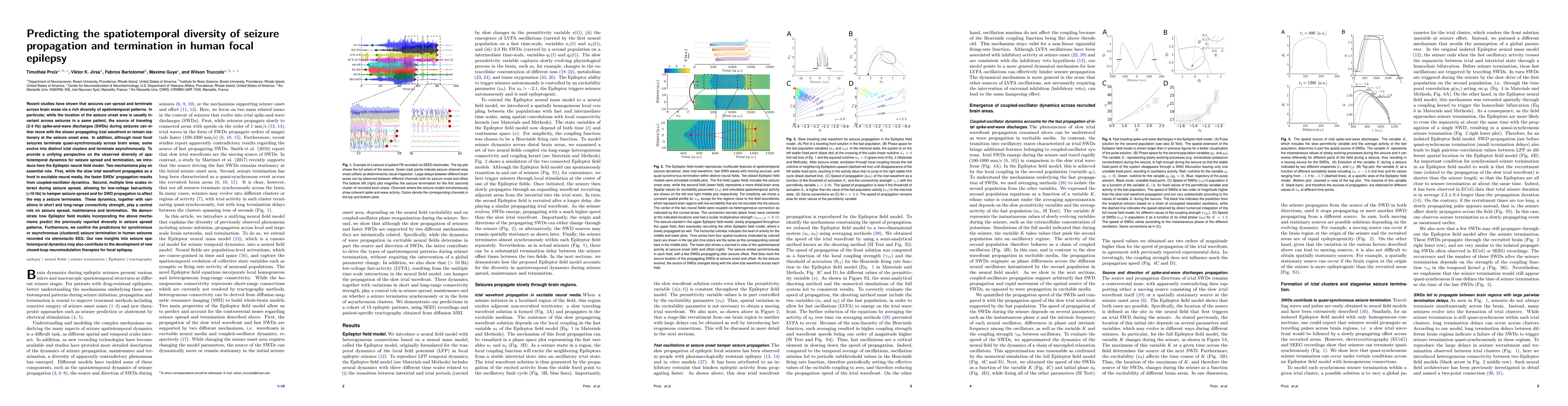 This paper introduces the Epileptor neural field model to predict the diverse spatiotemporal patterns of seizure propagation and termination in human focal epilepsy. The model incorporates mechanisms of slow ictal wavefront propagation and coupled-oscillator dynamics for faster spike-and-wave discharges, along with interactions between multiple time scales to explain the variability in seizure spread and termination patterns observed in stereotactic EEG recordings.