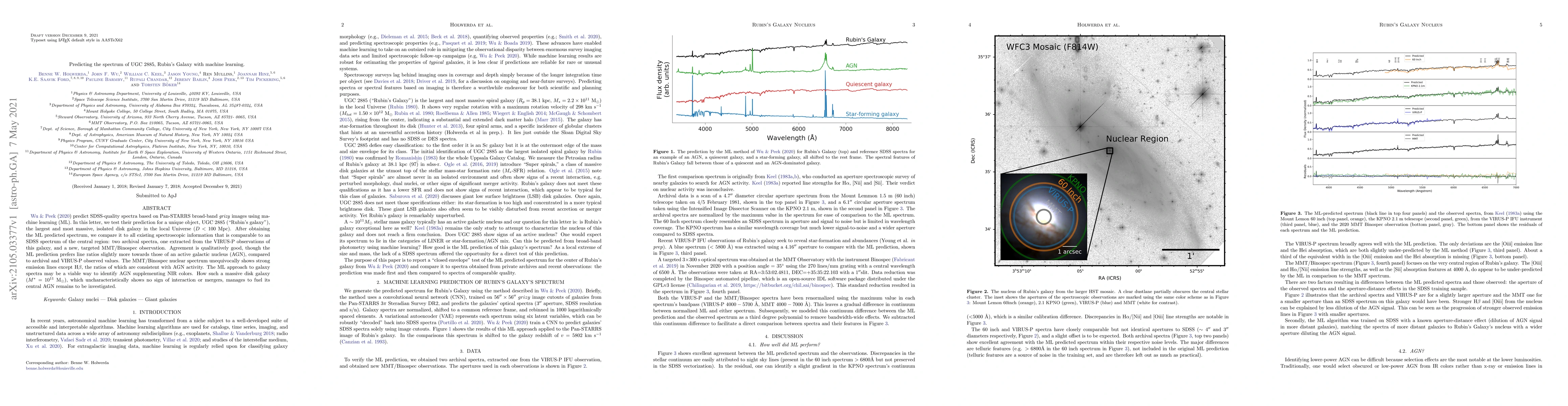 Wu & Peek (2020) predict SDSS-quality spectra based on Pan-STARRS broad-band \textit{grizy} images using machine learning (ML). In this letter, we test their prediction for a unique object, UGC 2885 ("Rubin's galaxy"), the largest and most massive, isolated disk galaxy in the local Universe ($D<100$ Mpc). After obtaining the ML predicted spectrum, we compare it to all existing spectroscopic information that is comparable to an SDSS spectrum of the central region: two archival spectra, one extracted from the VIRUS-P observations of this galaxy, and a new, targeted MMT/Binospec observation. Agreement is qualitatively good, though the ML prediction prefers line ratios slightly more towards those of an active galactic nucleus (AGN), compared to archival and VIRUS-P observed values. The MMT/Binospec nuclear spectrum unequivocally shows strong emission lines except H$\beta$, the ratios of which are consistent with AGN activity. The ML approach to galaxy spectra may be a viable way to identify AGN supplementing NIR colors. How such a massive disk galaxy ($M^* = 10^{11}$ M$_\odot$), which uncharacteristically shows no sign of interaction or mergers, manages to fuel its central AGN remains to be investigated.