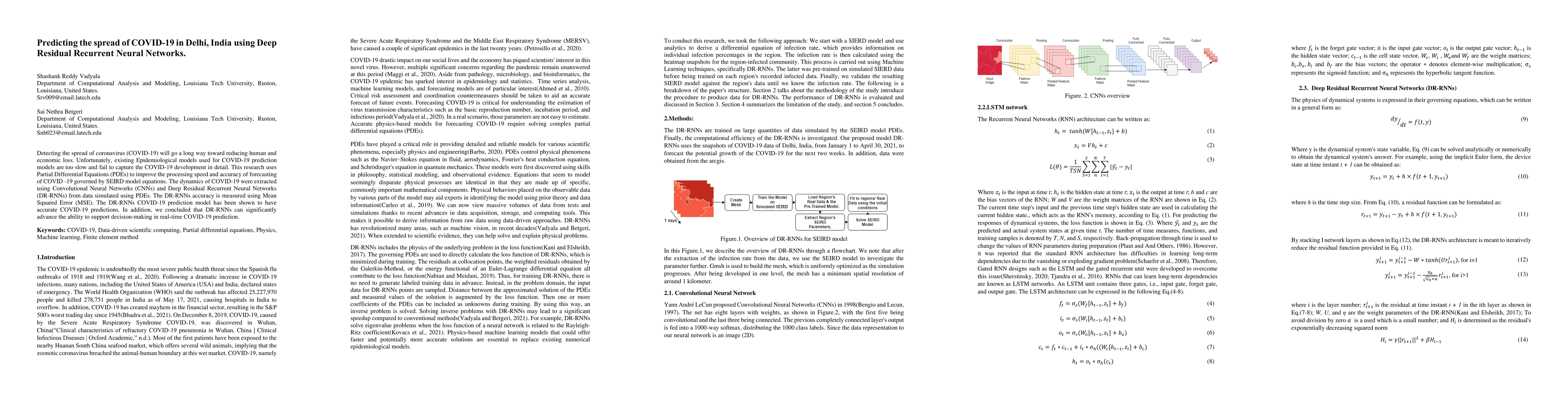 Detecting the spread of coronavirus will go a long way toward reducing human and economic loss. Unfortunately, existing Epidemiological models used for COVID 19 prediction models are too slow and fail to capture the COVID-19 development in detail. This research uses Partial Differential Equations to improve the processing speed and accuracy of forecasting of COVID 19 governed by SEIRD model equations. The dynamics of COVID 19 were extracted using Convolutional Neural Networks and Deep Residual Recurrent Neural Networks from data simulated using PDEs. The DRRNNs accuracy is measured using Mean Squared Error. The DRRNNs COVID-19 prediction model has been shown to have accurate COVID-19 predictions. In addition, we concluded that DR-RNNs can significantly advance the ability to support decision-making in real time COVID-19 prediction.