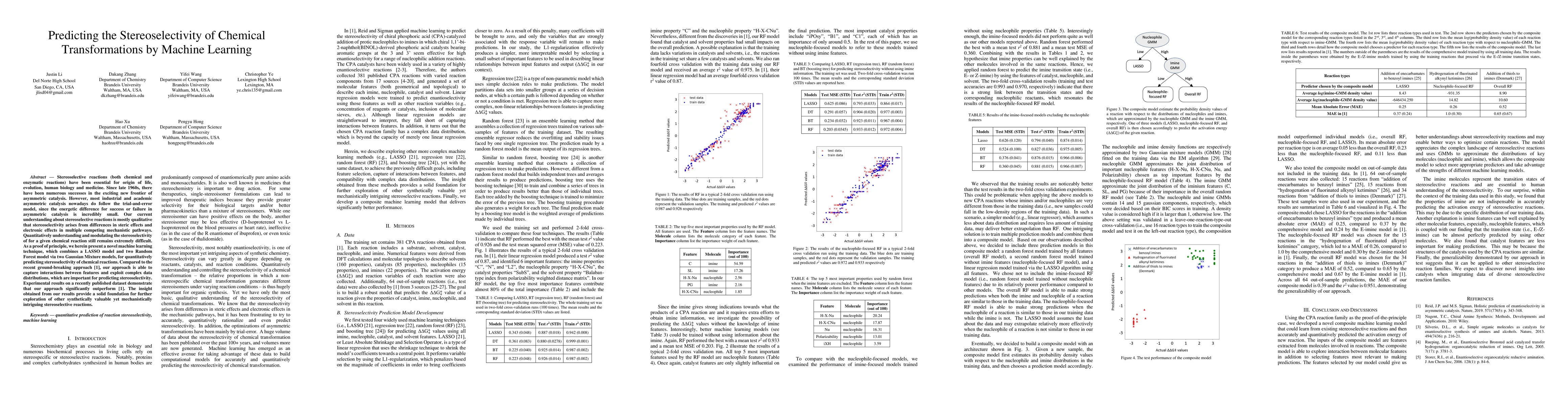 Stereoselective reactions (both chemical and enzymatic reactions) have been essential for origin of life, evolution, human biology and medicine. Since late 1960s, there have been numerous successes in the exciting new frontier of asymmetric catalysis. However, most industrial and academic asymmetric catalysis nowadays do follow the trial-and-error model, since the energetic difference for success or failure in asymmetric catalysis is incredibly small. Our current understanding about stereoselective reactions is mostly qualitative that stereoselectivity arises from differences in steric effects and electronic effects in multiple competing mechanistic pathways. Quantitatively understanding and modulating the stereoselectivity of for a given chemical reaction still remains extremely difficult. As a proof of principle, we herein present a novel machine learning technique, which combines a LASSO model and two Random Forest model via two Gaussian Mixture models, for quantitatively predicting stereoselectivity of chemical reactions. Compared to the recent ground-breaking approach [1], our approach is able to capture interactions between features and exploit complex data distributions, which are important for predicting stereoselectivity. Experimental results on a recently published dataset demonstrate that our approach significantly outperform [1]. The insight obtained from our results provide a solid foundation for further exploration of other synthetically valuable yet mechanistically intriguing stereoselective reactions.