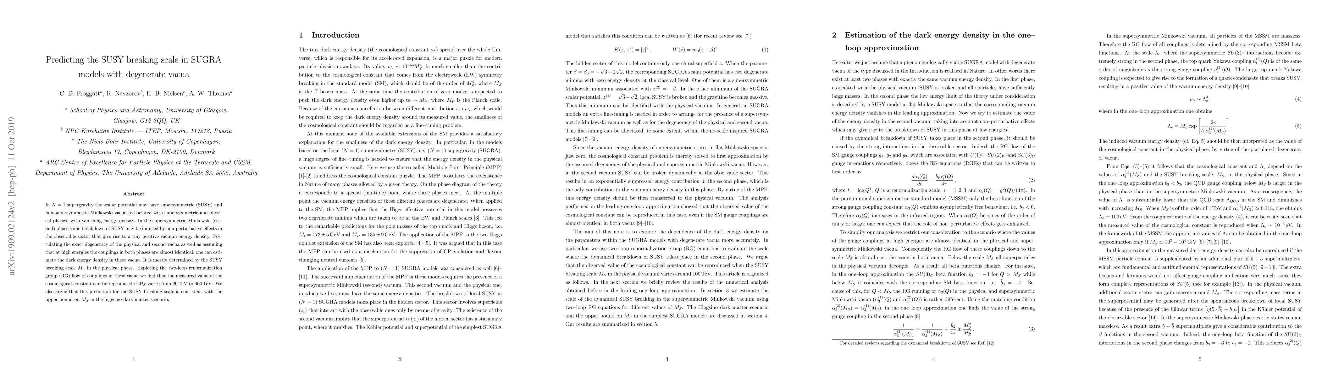 In N=1 supergravity the scalar potential may have supersymmetric (SUSY) and non-supersymmetric Minkowski vacua (associated with supersymmetric and physical phases) with vanishing energy density. In the supersymmetric Minkowski (second) phase some breakdown of SUSY may be induced by non-perturbative effects in the observable sector that give rise to a tiny positive vacuum energy density. Postulating the exact degeneracy of the physical and second vacua as well as assuming that at high energies the couplings in both phases are almost identical, one can estimate the dark energy density in these vacua. It is mostly determined by the SUSY breaking scale M_S in the physical phase. Exploring the two-loop renormalization group (RG) flow of couplings in these vacua we find that the measured value of the cosmological constant can be reproduced if M_S varies from 20 TeV to 400 TeV. We also argue that this prediction for the SUSY breaking scale is consistent with the upper bound on M_S in the higgsino dark matter scenario.