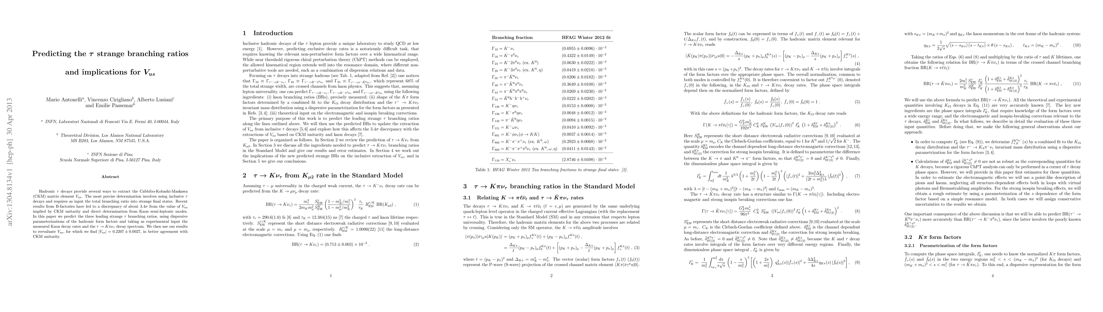 This paper predicts the branching ratios for the three leading strange tau decay modes, aiming to resolve the 3.4 sigma discrepancy in V_{us} determination. The results yield |V_{us}|=0.2207 \pm 0.0027, aligning more closely with CKM unitarity predictions.