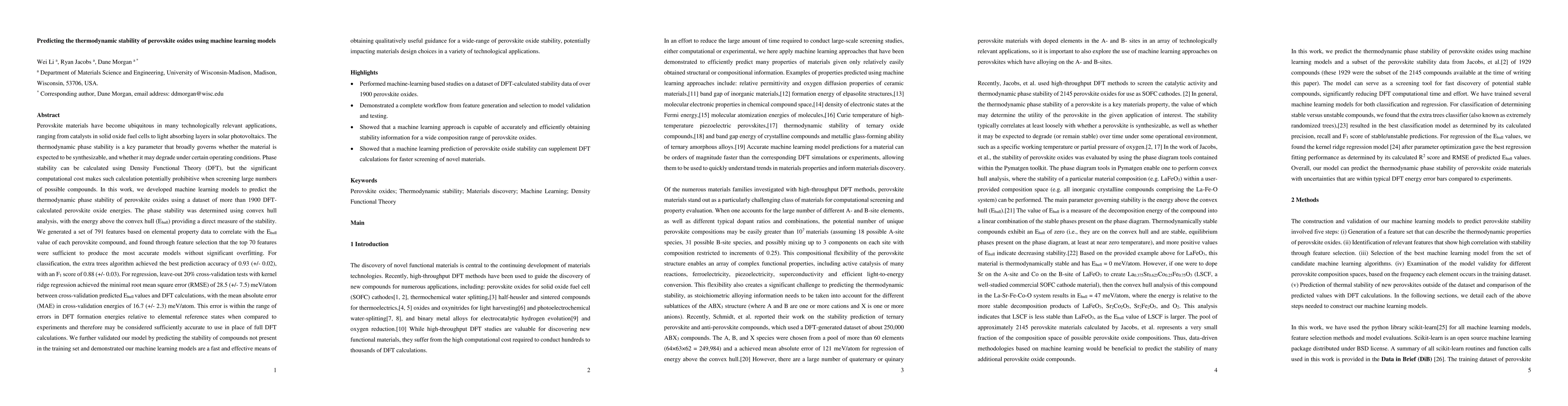 This research develops machine learning models to predict the thermodynamic stability of perovskite oxides, leveraging a dataset of over 1900 Density Functional Theory calculations. The models, particularly the extra trees classifier and kernel ridge regression, achieved high accuracy and low error rates, offering a fast and effective alternative to traditional computational methods for materials design.