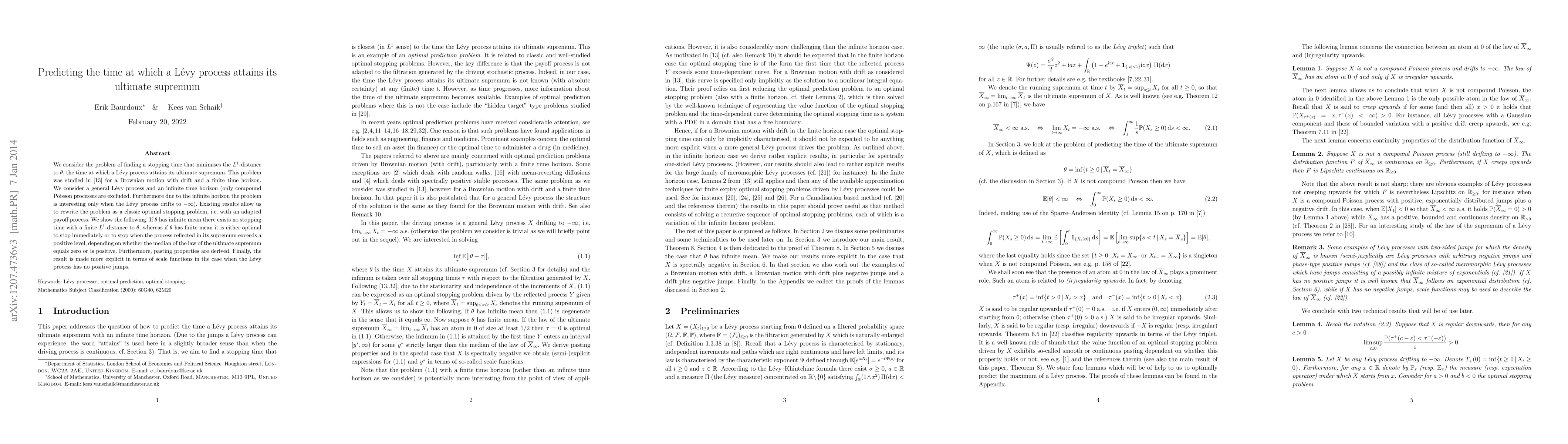 This paper addresses the optimal stopping problem to minimize the $L^1$-distance to $\theta$, the time when a Lévy process reaches its ultimate supremum, under an infinite time horizon. It finds that no finite distance exists if $\theta$ has infinite mean, while finite mean allows either immediate stopping or stopping when the reflected process exceeds a certain level, depending on the median of the ultimate supremum's law.