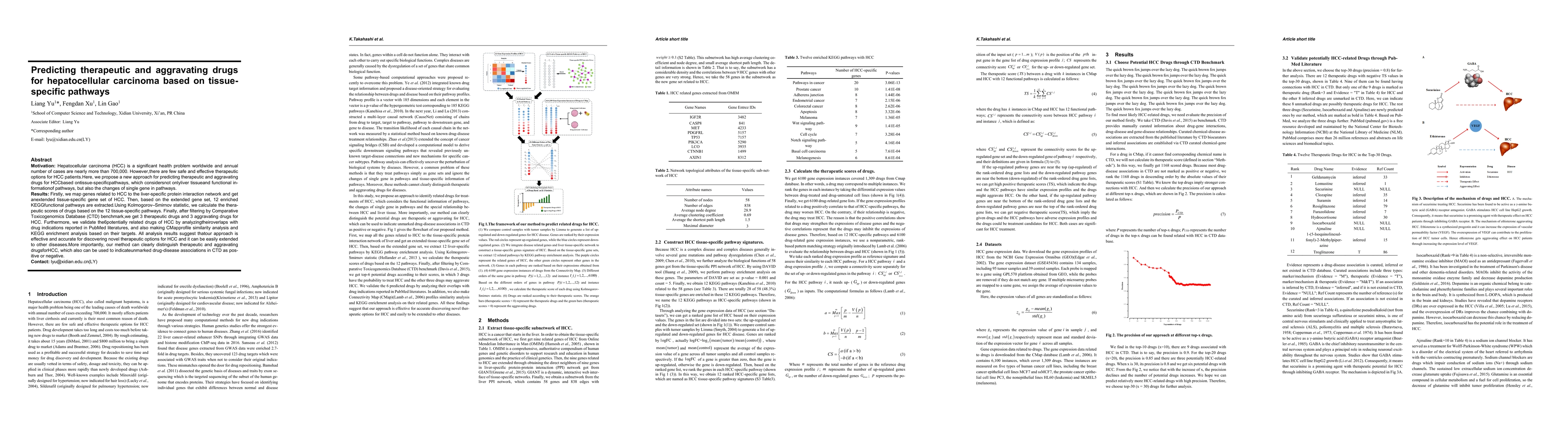 Motivation: Hepatocellular carcinoma (HCC) is a significant health problem worldwide and annual number of cases are nearly more than 700,000. However,there are few safe and effective thera-peutic options for HCC patients.Here, we propose a new approach for predicting therapeutic and aggravating drugs for HCCbased ontissue-specificpathways, which considersnot onlyliver tis-sueand functional informationof pathways, but also the changes of single gene in pathways. Results: Firstly, we map genes related to HCC to the liver-specific protein interaction network and get anextended tissue-specific gene set of HCC. Then, based on the extended gene set, 12 en-riched KEGGfunctional pathways are extracted.Using Kolmogorov-Smirnov statistic, we calculate the therapeutic scores of drugs based on the 12 tissue-specific pathways. Finally, after filtering by Comparative Toxicogenomics Database (CTD) benchmark,we get 3 therapeutic drugs and 3 ag-gravating drugs for HCC. Furthermore, we validate the6potentially related drugs of HCC by analyz-ingtheiroverlaps with drug indications reported in PubMed literatures, and also making CMapprofile similarity analysis and KEGG enrichment analysis based on their targets. All analysis results sug-gest thatour approach is effective and accurate for discovering novel therapeutic options for HCC and it can be easily extended to other diseases.More importantly, our method can clearly distin-guish therapeutic and aggravating drugsforHCC, which also can be used to indicateunmarked drug-disease associations in CTD as positive or negative.