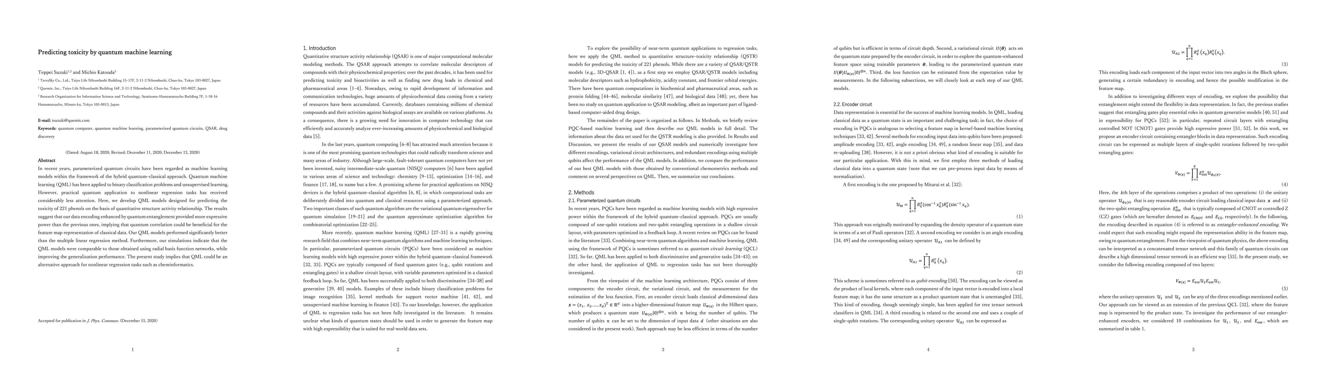 In recent years, parameterized quantum circuits have been regarded as machine learning models within the framework of the hybrid quantum-classical approach. Quantum machine learning (QML) has been applied to binary classification problems and unsupervised learning. However, practical quantum application to nonlinear regression tasks has received considerably less attention. Here, we develop QML models designed for predicting the toxicity of 221 phenols on the basis of quantitative structure activity relationship. The results suggest that our data encoding enhanced by quantum entanglement provided more expressive power than the previous ones, implying that quantum correlation could be beneficial for the feature map representation of classical data. Our QML models performed significantly better than the multiple linear regression method. Furthermore, our simulations indicate that the QML models were comparable to those obtained using radial basis function networks, while improving the generalization performance. The present study implies that QML could be an alternative approach for nonlinear regression tasks such as cheminformatics.