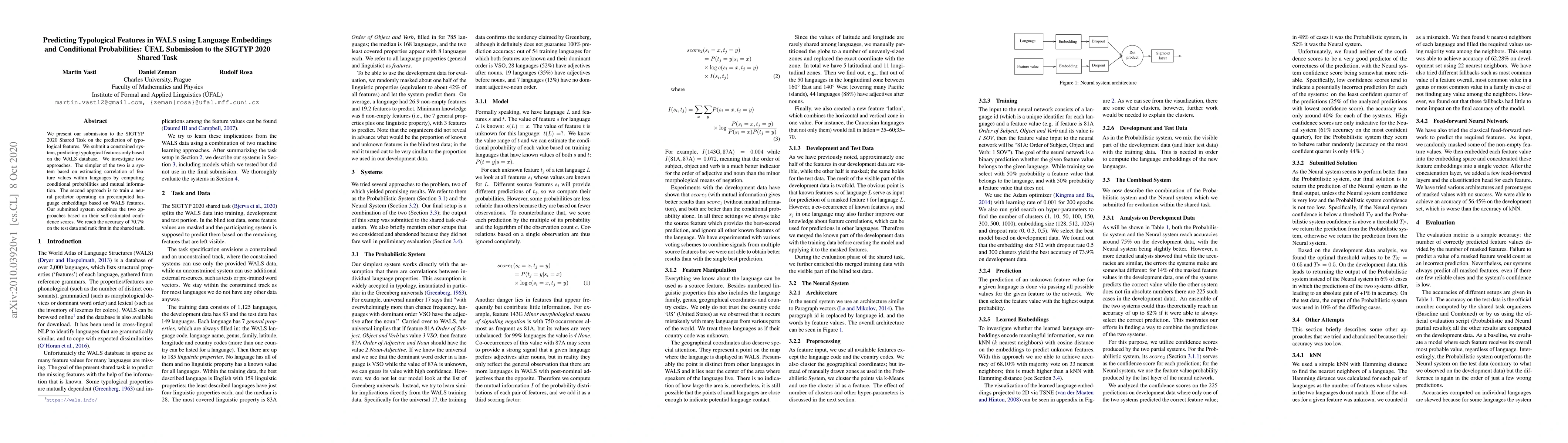 This paper describes a submission for the SIGTYP 2020 Shared Task, predicting typological features using conditional probabilities and neural predictors based on the WALS database. The best-performing combined system achieves 70.7% accuracy, securing the first rank in the task.
