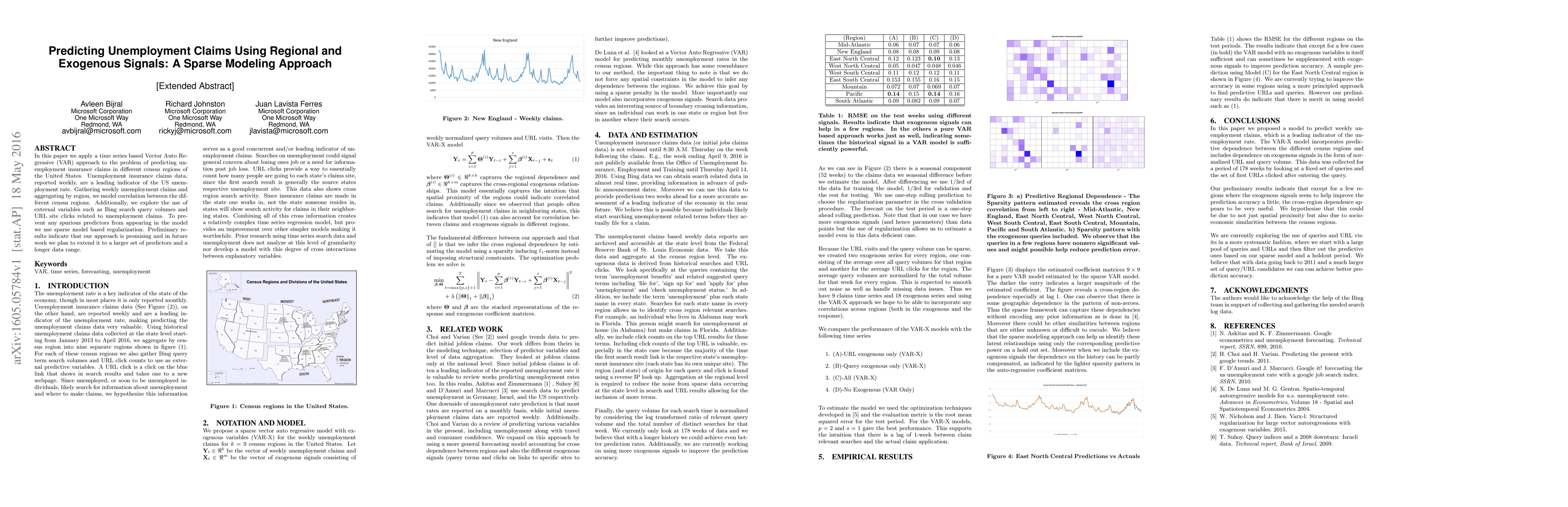 In this paper we apply a time series based Vector Auto Regressive (VAR) approach to the problem of predicting unemployment insurance claims in different census regions of the United States. Unemployment insurance claims data, reported weekly, are a leading indicator of the US unemployment rate. Gathering weekly unemployment claims and aggregating by region, we model correlation between the different census regions. Additionally, we explore the use of external variables such as Bing search query volumes and URL site clicks related to unemployment claims. To prevent any spurious predictors from appearing in the model we use sparse model based regularization. Preliminary results indicate that our approach is promising and in ongoing work we are extending the approach to a larger set of predictors and a longer data range.