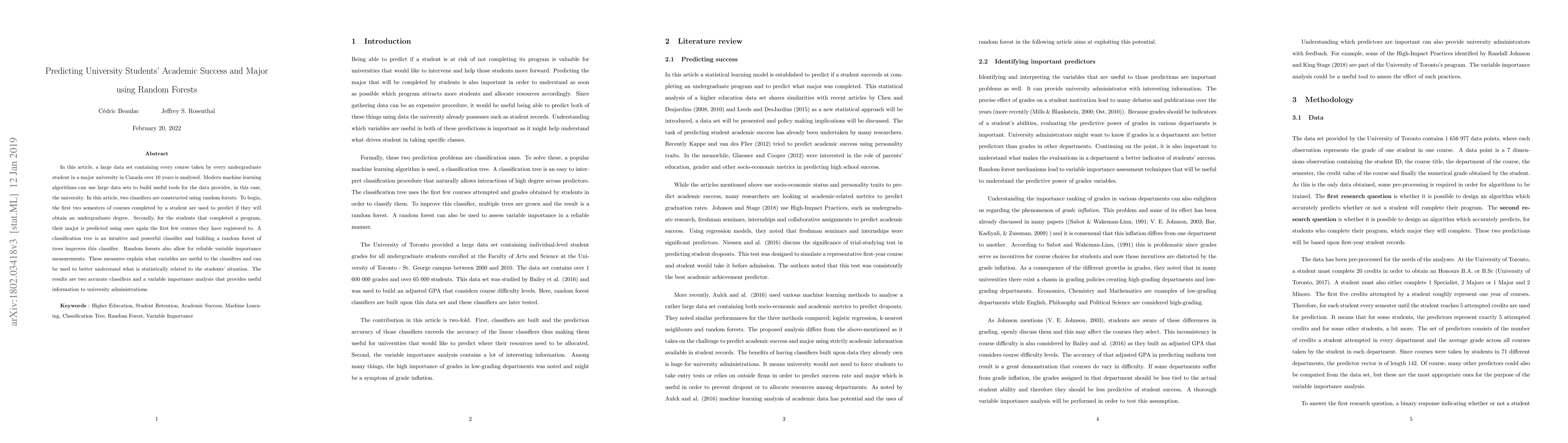 This research paper uses random forests to predict university students' academic success and major based on their course history, achieving accurate classifiers with valuable insights into student performance.