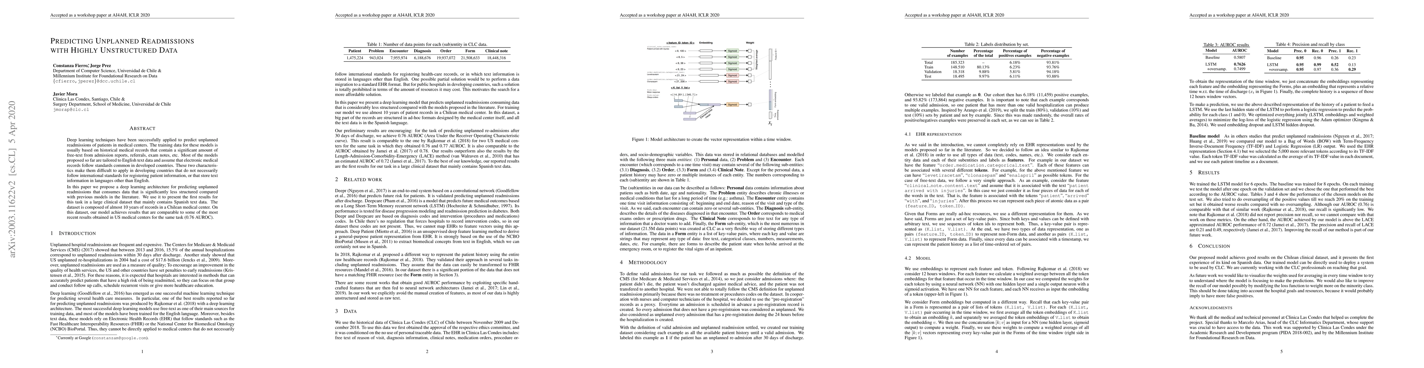 This paper proposes a deep learning architecture for predicting unplanned readmissions using highly unstructured data, particularly focusing on Spanish text from Chilean medical records. The model achieves comparable results to those in US medical centers, demonstrating its effectiveness for non-standardized, multilingual datasets.