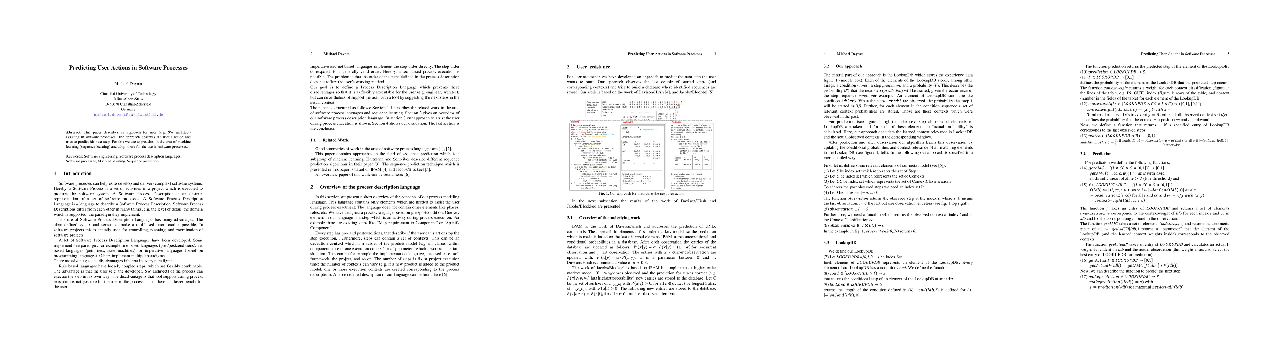This paper describes an approach for user (e.g. SW architect) assisting in software processes. The approach observes the user's action and tries to predict his next step. For this we use approaches in the area of machine learning (sequence learning) and adopt these for the use in software processes. Keywords: Software engineering, Software process description languages, Software processes, Machine learning, Sequence prediction