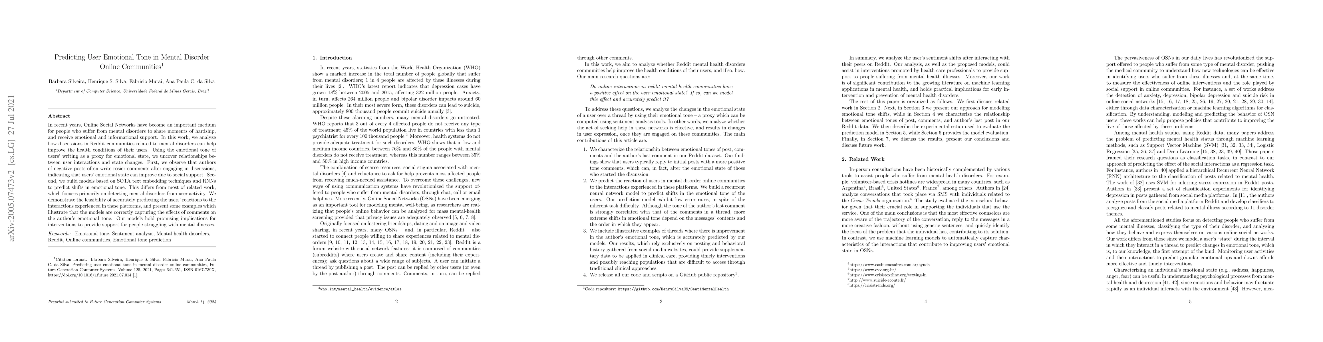 This paper analyzes Reddit discussions in mental disorder communities to predict shifts in users' emotional tone, showing that social support can improve emotional states. The study builds advanced models using text embeddings and RNNs to forecast emotional changes, offering potential for supportive interventions for individuals with mental illnesses.