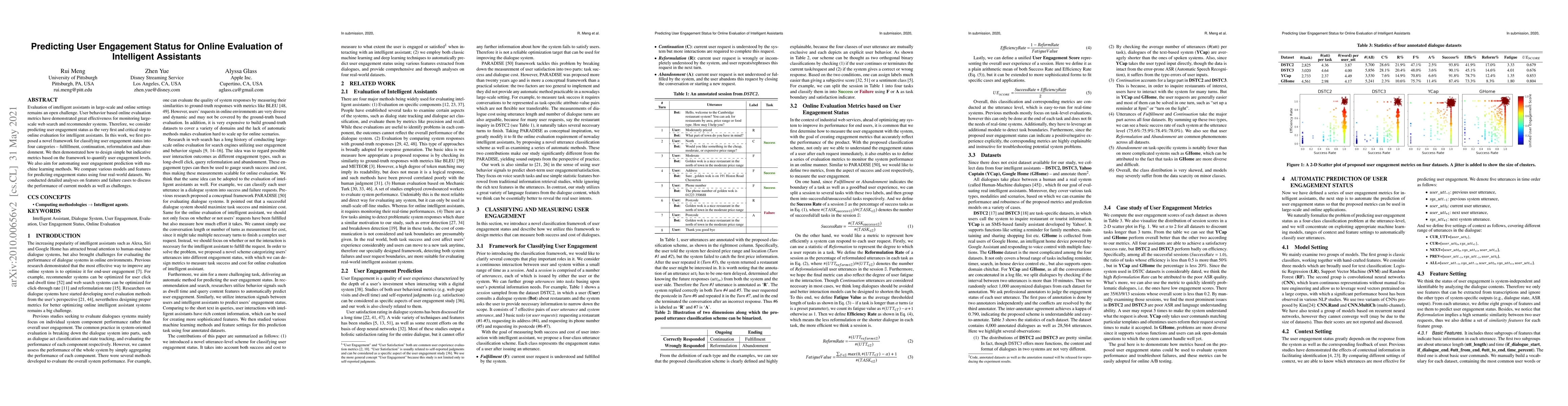 This paper proposes a framework to classify user engagement status into four categories: fulfillment, continuation, reformulation, and abandonment, for evaluating intelligent assistants online. The authors design metrics based on this framework and explore machine learning models to automate engagement prediction, comparing their performance across four datasets and discussing challenges and failure cases.