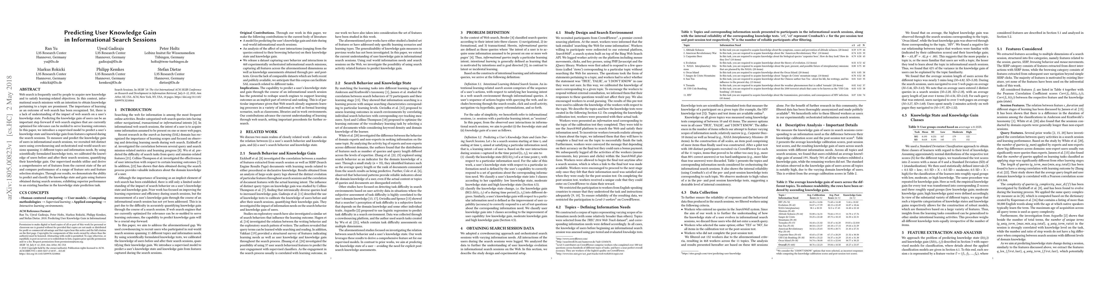 This paper introduces a supervised model to predict users' knowledge gain during informational search sessions by analyzing features captured during these sessions. The study involved 468 users across 11 topics, employing scientifically formulated tests to measure pre- and post-search knowledge, and demonstrated superior performance in predicting knowledge state and gain compared to existing baselines.