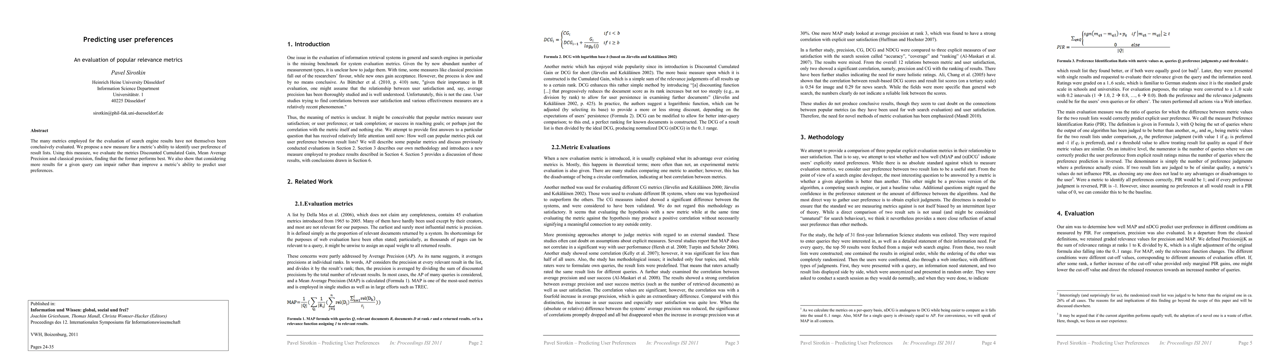 The many metrics employed for the evaluation of search engine results have not themselves been conclusively evaluated. We propose a new measure for a metric's ability to identify user preference of result lists. Using this measure, we evaluate the metrics Discounted Cumulated Gain, Mean Average Precision and classical precision, finding that the former performs best. We also show that considering more results for a given query can impair rather than improve a metric's ability to predict user preferences.