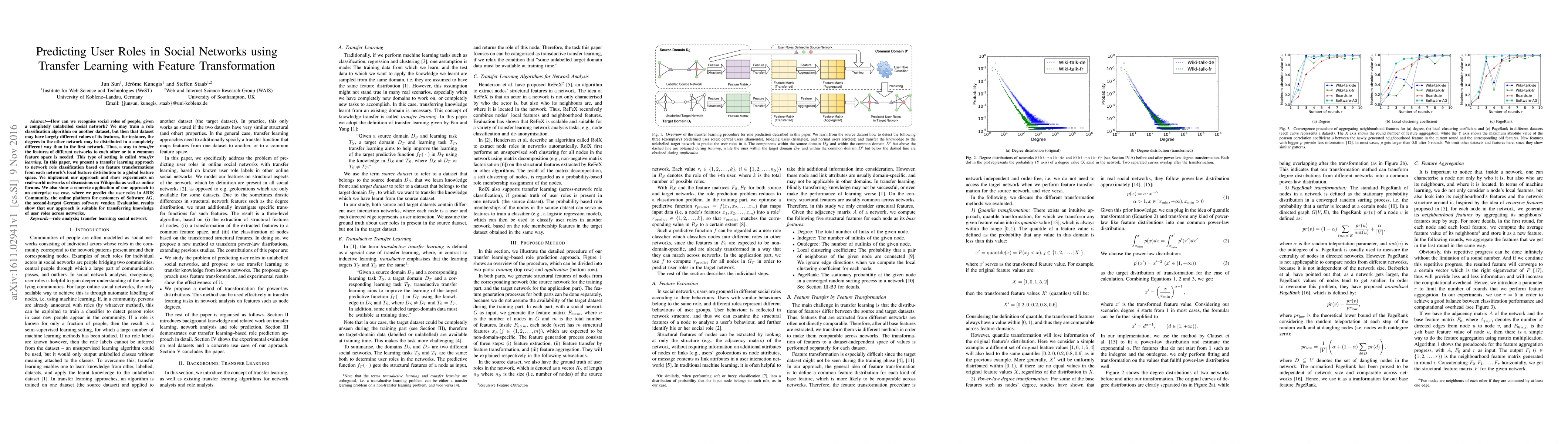 This research introduces a transfer learning method to identify social roles in unlabeled networks by transforming local features into a global feature space. Experiments on real-world datasets validate the approach.