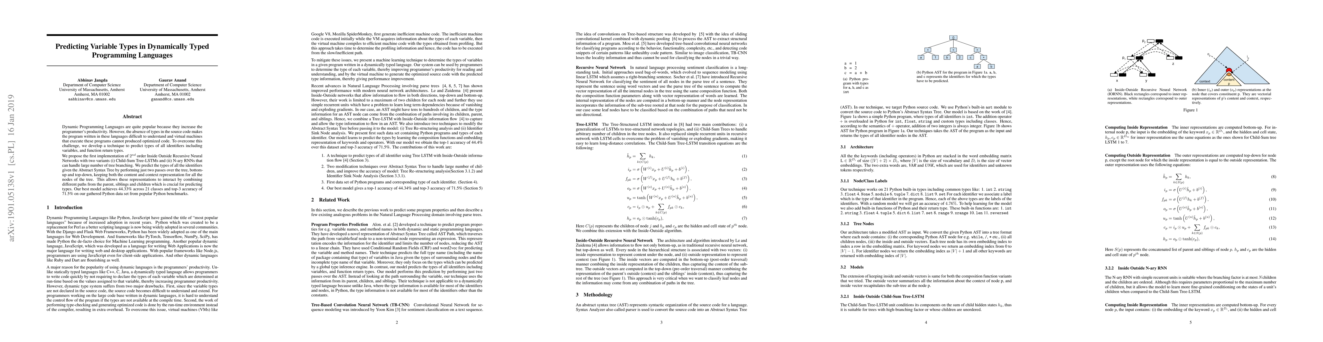 This paper proposes a technique to predict types in dynamically typed programming languages using Inside Outside Recursive Neural Networks, achieving 44.33% accuracy and 71.5% top-3 accuracy on a Python dataset. The method involves two passes over the Abstract Syntax Tree to combine context and content representations for accurate type prediction.