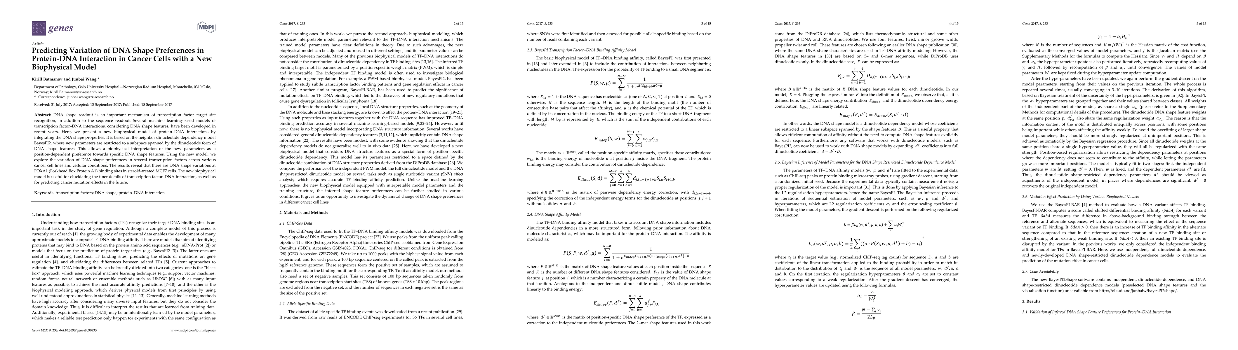 This paper introduces a new biophysical model for predicting protein-DNA interaction based on DNA shape features, revealing significant variations in DNA shape preferences in cancer cells, particularly in FOXA1 binding sites post-steroid treatment in MCF7 cells. The model's potential for enhancing cancer mutation effect predictions is highlighted.