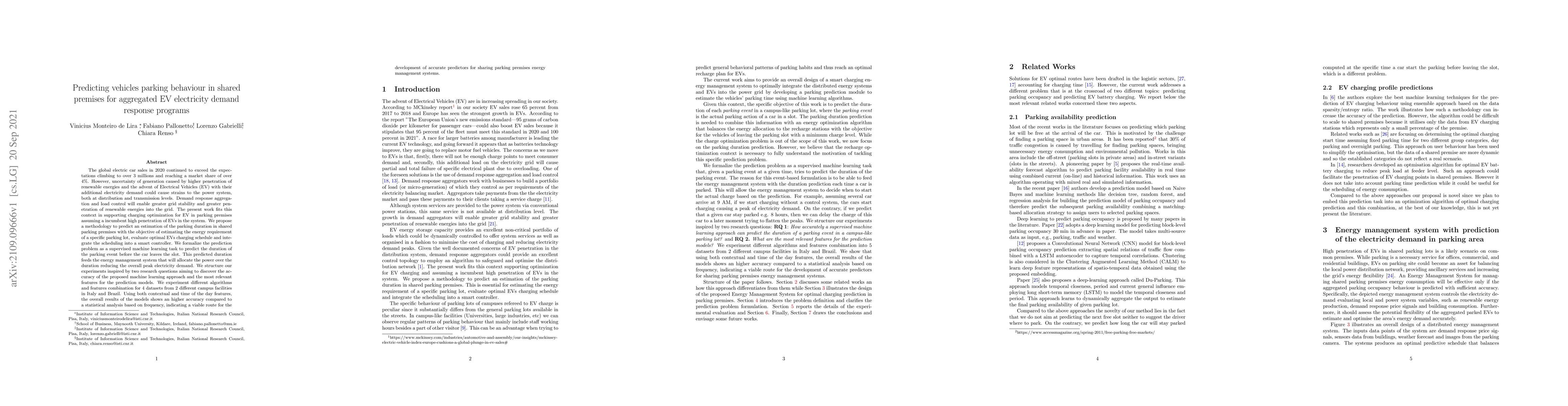 The global electric car sales in 2020 continued to exceed the expectations climbing to over 3 millions and reaching a market share of over 4%. However, uncertainty of generation caused by higher penetration of renewable energies and the advent of Electrical Vehicles (EV) with their additional electricity demand could cause strains to the power system, both at distribution and transmission levels. Demand response aggregation and load control will enable greater grid stability and greater penetration of renewable energies into the grid. The present work fits this context in supporting charging optimization for EV in parking premises assuming a incumbent high penetration of EVs in the system. We propose a methodology to predict an estimation of the parking duration in shared parking premises with the objective of estimating the energy requirement of a specific parking lot, evaluate optimal EVs charging schedule and integrate the scheduling into a smart controller. We formalize the prediction problem as a supervised machine learning task to predict the duration of the parking event before the car leaves the slot. This predicted duration feeds the energy management system that will allocate the power over the duration reducing the overall peak electricity demand. We structure our experiments inspired by two research questions aiming to discover the accuracy of the proposed machine learning approach and the most relevant features for the prediction models. We experiment different algorithms and features combination for 4 datasets from 2 different campus facilities in Italy and Brazil. Using both contextual and time of the day features, the overall results of the models shows an higher accuracy compared to a statistical analysis based on frequency, indicating a viable route for the development of accurate predictors for sharing parking premises energy management systems