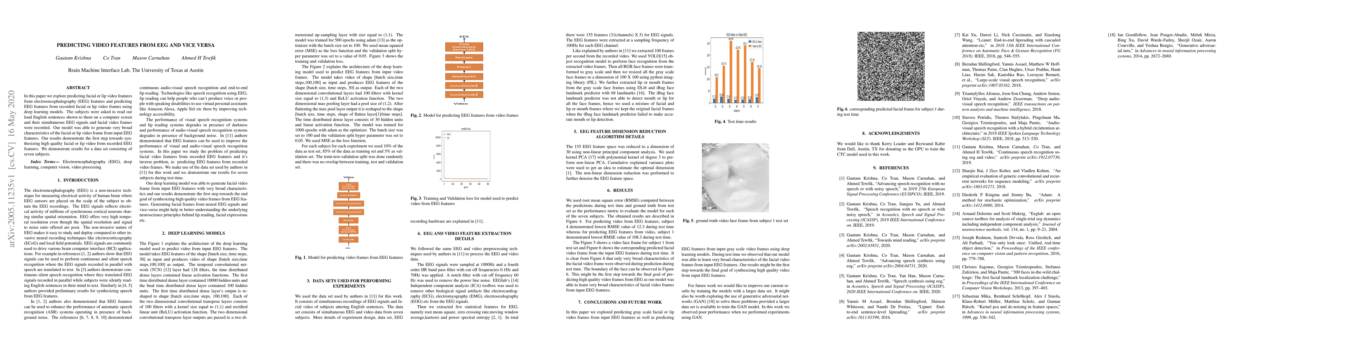 In this paper we explore predicting facial or lip video features from electroencephalography (EEG) features and predicting EEG features from recorded facial or lip video frames using deep learning models. The subjects were asked to read out loud English sentences shown to them on a computer screen and their simultaneous EEG signals and facial video frames were recorded. Our model was able to generate very broad characteristics of the facial or lip video frame from input EEG features. Our results demonstrate the first step towards synthesizing high quality facial or lip video from recorded EEG features. We demonstrate results for a data set consisting of seven subjects.