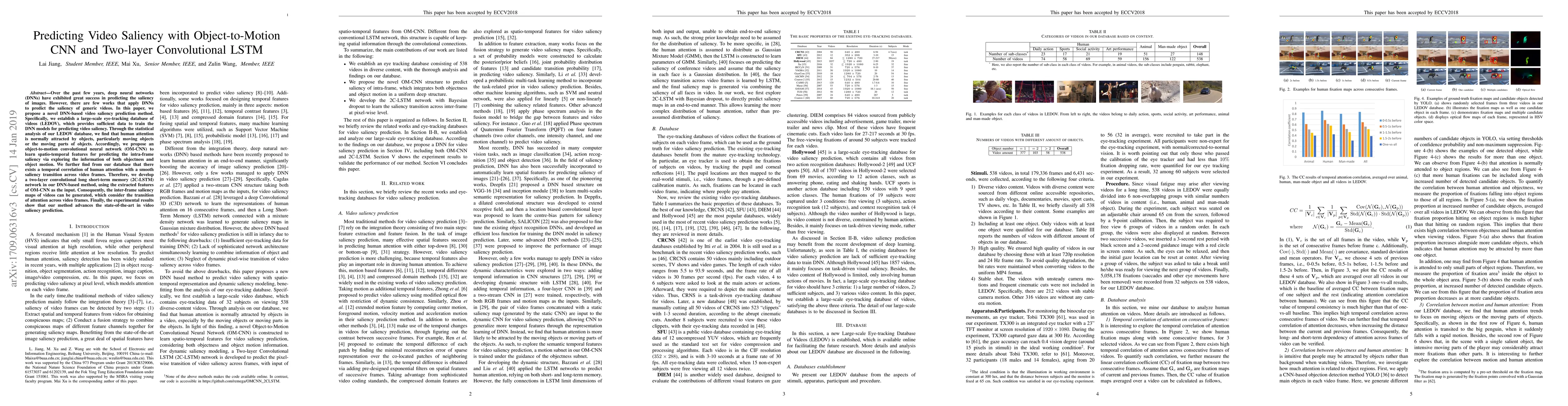 This paper proposes a novel deep neural network method for predicting video saliency, utilizing an object-to-motion convolutional neural network (OM-CNN) to capture spatial features and a two-layer convolutional LSTM (2C-LSTM) to model temporal correlations. The method is trained on a new large-scale video eye-tracking database, LEDOV, and demonstrates superior performance in video saliency prediction.