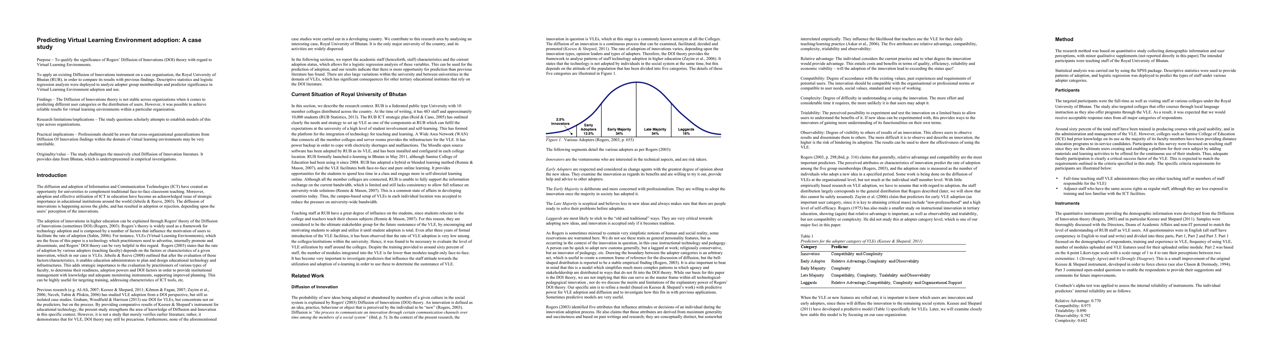 Purpose - To qualify the significance of Rogers' Diffusion of Innovations theory with regard to Virtual Learning Environments. To apply an existing Diffusion of Innovations instrument on a case organisation, the Royal University of Bhutan (RUB), in order to compare its results with previous findings. Descriptive statistics and logistic regression analysis were deployed to analyze adopter group memberships and predictor significance in Virtual Learning Environment adoption and use. Findings - The Diffusion of Innovations theory is not stable across organizations when it comes to predicting different user categories or the distribution of users. However, it was possible to achieve reliable results for virtual learning environments within a particular organization. Research limitations ND implications - The study questions scholarly attempts to establish models of this type across organizations. Practical implications - Professionals should be aware that cross-organizational generalizations from Diffusion Of Innovation findings within the domain of virtual learning environments may be very unreliable. Originality and value - The study challenges the massively cited Diffusion of Innovation literature. It provides data from Bhutan, which is underrepresented in empirical investigations.