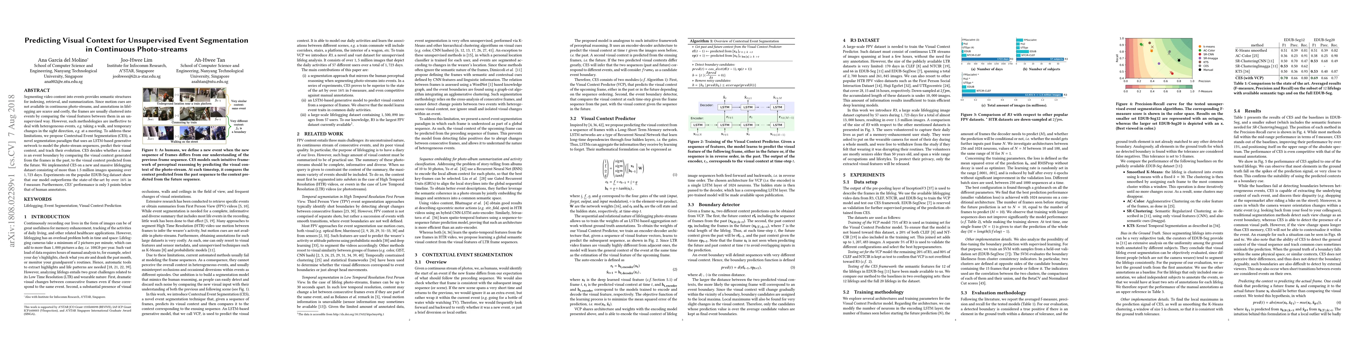 Segmenting video content into events provides semantic structures for indexing, retrieval, and summarization. Since motion cues are not available in continuous photo-streams, and annotations in lifelogging are scarce and costly, the frames are usually clustered into events by comparing the visual features between them in an unsupervised way. However, such methodologies are ineffective to deal with heterogeneous events, e.g. taking a walk, and temporary changes in the sight direction, e.g. at a meeting. To address these limitations, we propose Contextual Event Segmentation (CES), a novel segmentation paradigm that uses an LSTM-based generative network to model the photo-stream sequences, predict their visual context, and track their evolution. CES decides whether a frame is an event boundary by comparing the visual context generated from the frames in the past, to the visual context predicted from the future. We implemented CES on a new and massive lifelogging dataset consisting of more than 1.5 million images spanning over 1,723 days. Experiments on the popular EDUB-Seg dataset show that our model outperforms the state-of-the-art by over 16% in f-measure. Furthermore, CES' performance is only 3 points below that of human annotators.