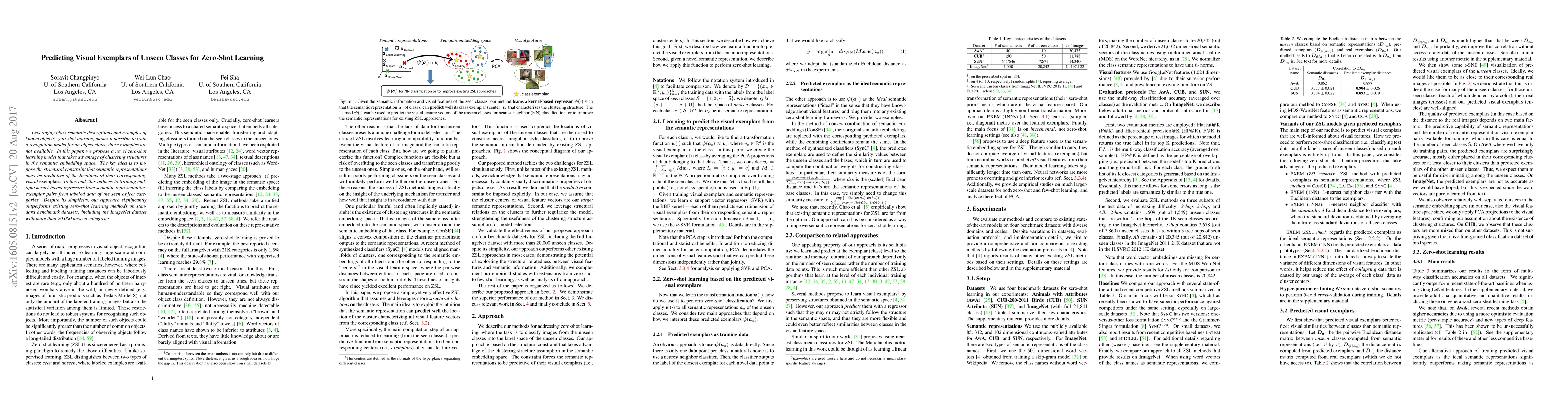 This paper introduces a novel zero-shot learning model that leverages semantic descriptions and known object examples to recognize unseen classes. It employs clustering in semantic embeddings and trains multiple regressors to predict visual exemplars, achieving superior performance on standard benchmarks like ImageNet.