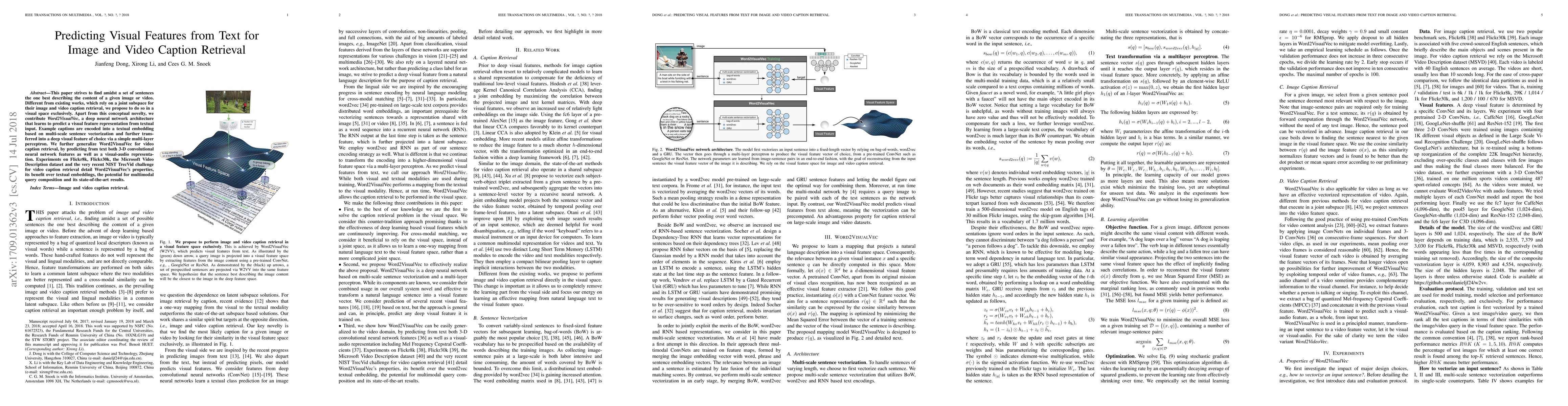 This paper introduces Word2VisualVec, a deep neural network that predicts visual features from text, enabling image and video caption retrieval in a visual space. It achieves state-of-the-art results on multiple datasets by encoding textual input into visual features and extending the method for video caption retrieval.