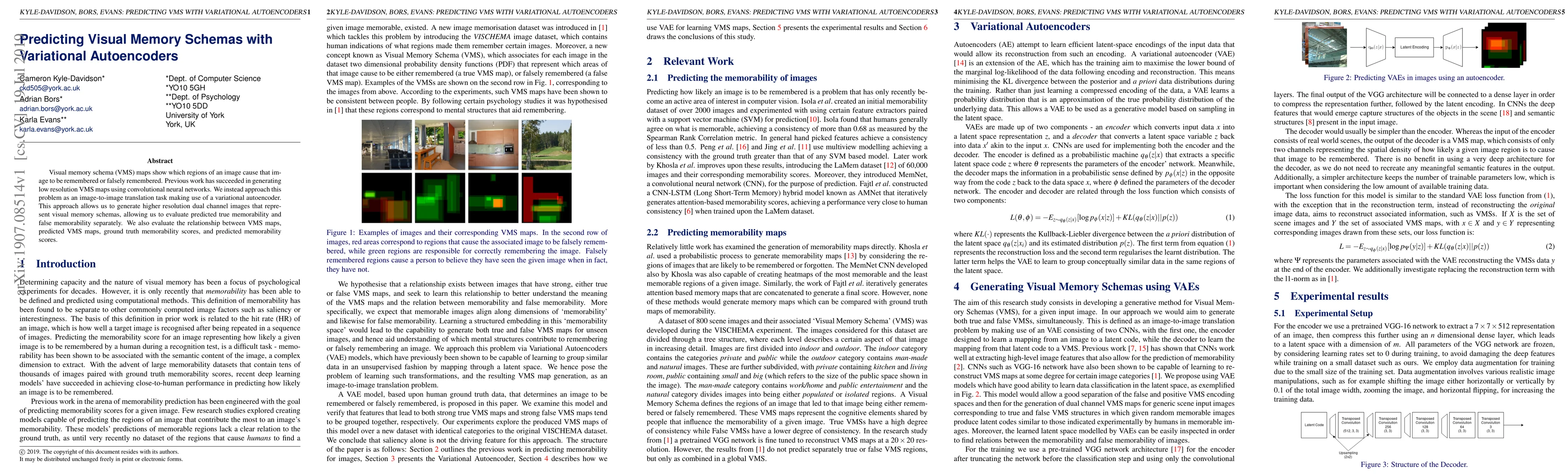 This paper proposes using a variational autoencoder for generating high-resolution visual memory schema maps, distinguishing true and false memorability, and evaluates the correlation between predicted and actual memorability scores. The method represents an advancement over previous convolutional neural network-based approaches.
