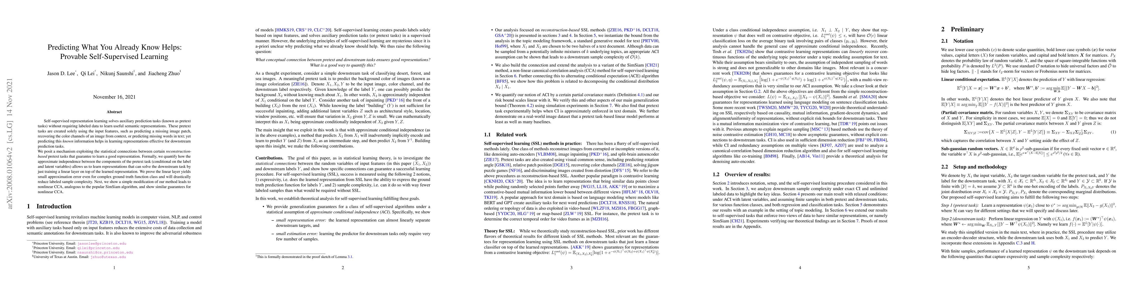 Self-supervised representation learning solves auxiliary prediction tasks (known as pretext tasks) without requiring labeled data to learn useful semantic representations. These pretext tasks are created solely using the input features, such as predicting a missing image patch, recovering the color channels of an image from context, or predicting missing words in text; yet predicting this \textit{known} information helps in learning representations effective for downstream prediction tasks. We posit a mechanism exploiting the statistical connections between certain {\em reconstruction-based} pretext tasks that guarantee to learn a good representation. Formally, we quantify how the approximate independence between the components of the pretext task (conditional on the label and latent variables) allows us to learn representations that can solve the downstream task by just training a linear layer on top of the learned representation. We prove the linear layer yields small approximation error even for complex ground truth function class and will drastically reduce labeled sample complexity. Next, we show a simple modification of our method leads to nonlinear CCA, analogous to the popular SimSiam algorithm, and show similar guarantees for nonlinear CCA.