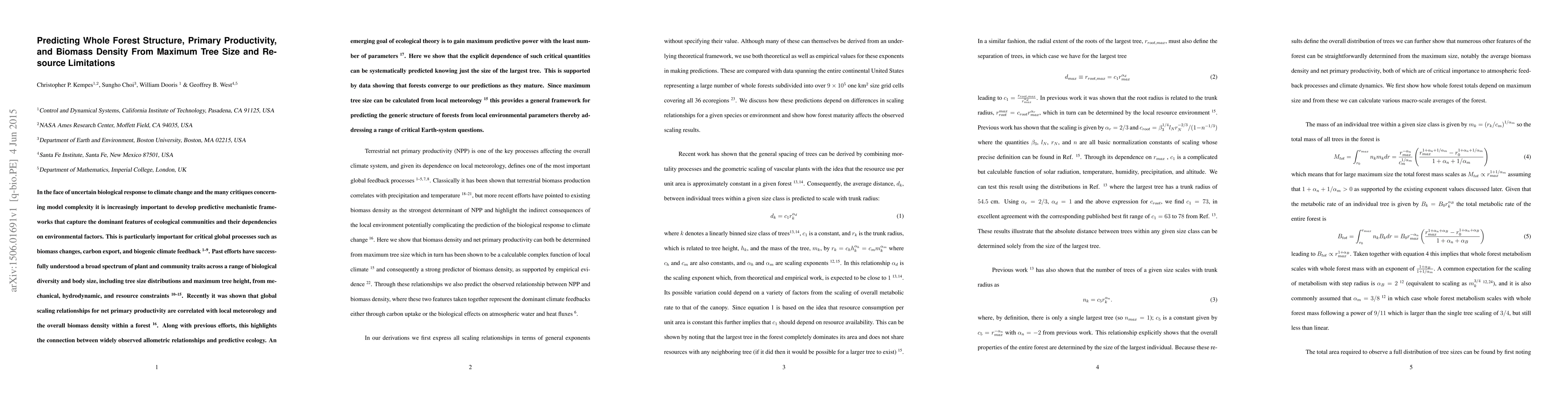 This paper develops a predictive mechanistic framework to estimate forest structure, primary productivity, and biomass density using only the maximum tree size and resource limitations. It demonstrates that forests' mature characteristics align with predictions based on these parameters, offering a simplified yet powerful tool for addressing global ecological and climate questions.