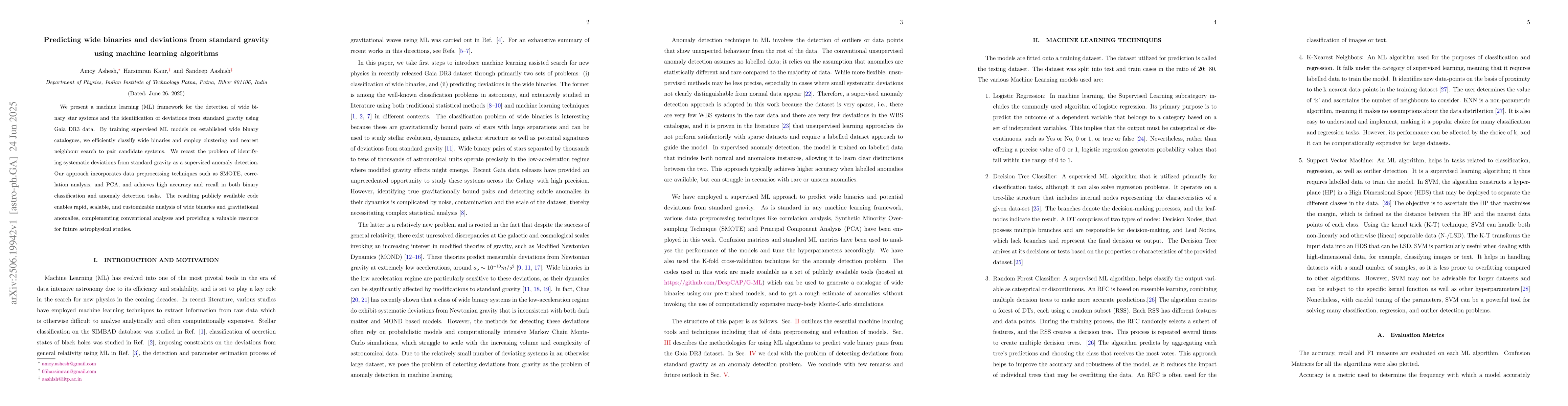 This research introduces a machine learning framework for identifying wide binary star systems and detecting deviations from standard gravity using Gaia DR3 data. The method, utilizing supervised ML models, achieves high accuracy in classification and anomaly detection, and includes preprocessing techniques like SMOTE and PCA. The publicly available code offers a scalable tool for analyzing wide binaries and gravitational anomalies, enhancing traditional astrophysical research methods.